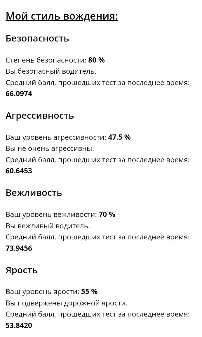 Привет други, давно ничего не писал, то время нету, то ещё какие причины. Но сегодня наткнулся на интересный тест и решил поделиться результатами, кстати сам тест тут — roadrage.ru/testovaya/
