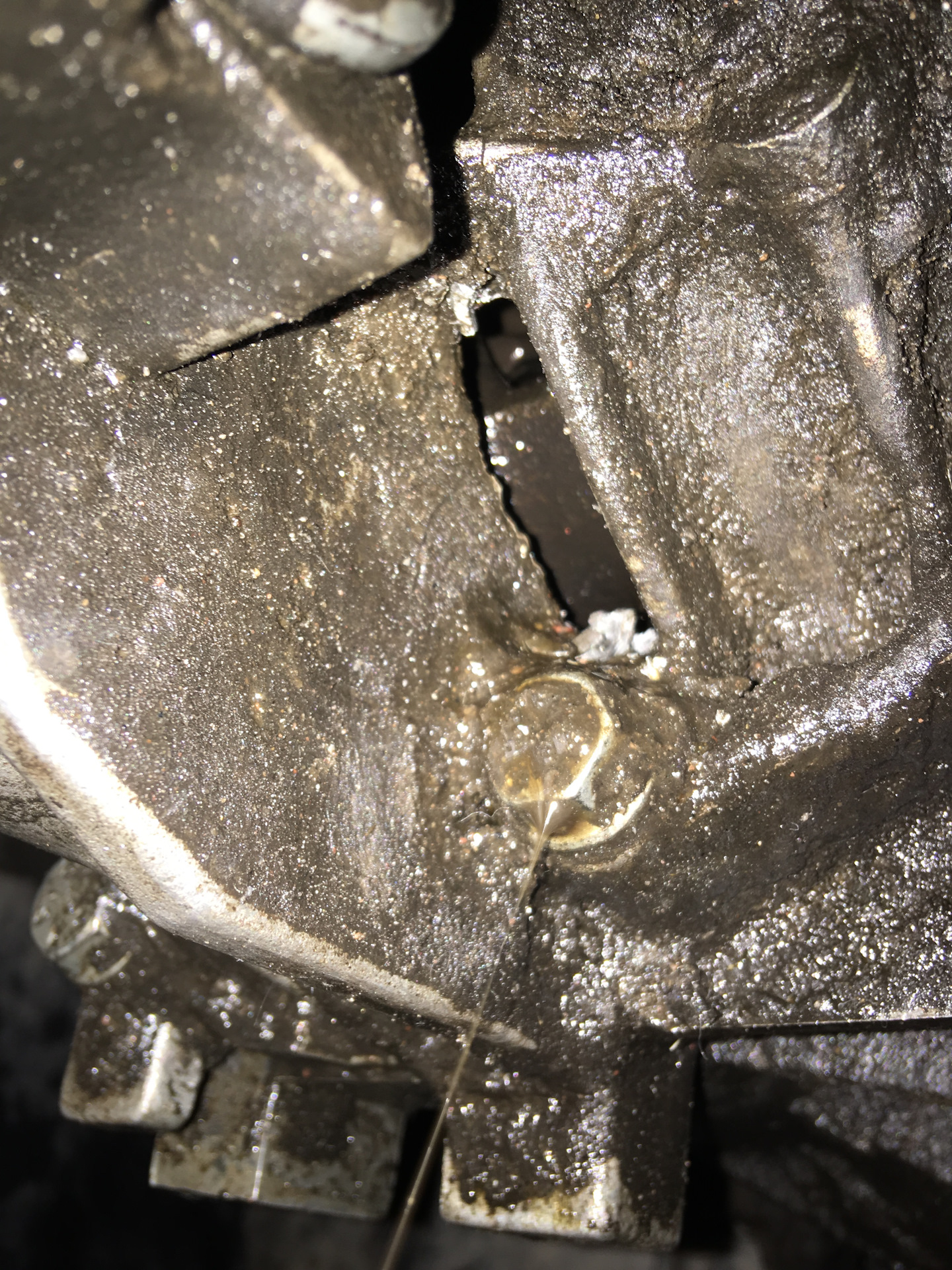 Доброго дня! В общем на днях произошла неприятность с нашей машиной. По приезду к дому из коробки передач вытекло практически все масло. А началось все со странного звука похожего на рвущейся ремень либо плеть. Ехал на третьей либо второй скорости и при выезде с разгонной полосы на главную, пришлось пару раз нажать на тормоз, дабы пропустить машину и в этом момент тот самый звук. Дальше появился стойкий запах трансмиссионного масла. Сразу возникла мысль что это у нас, но через какое то время запах почти исчез. А оказалось что все это время мы ехали с дыркой в коробке, при том что все передачи включались без проблем. По приезду домой заглянул под машину и увидел что она истекает маслом. Первая мысль — сальник порвало. Но оказалось проблема посерьезней. Вчера залез под машину и результат на фото. Как, что, почему?