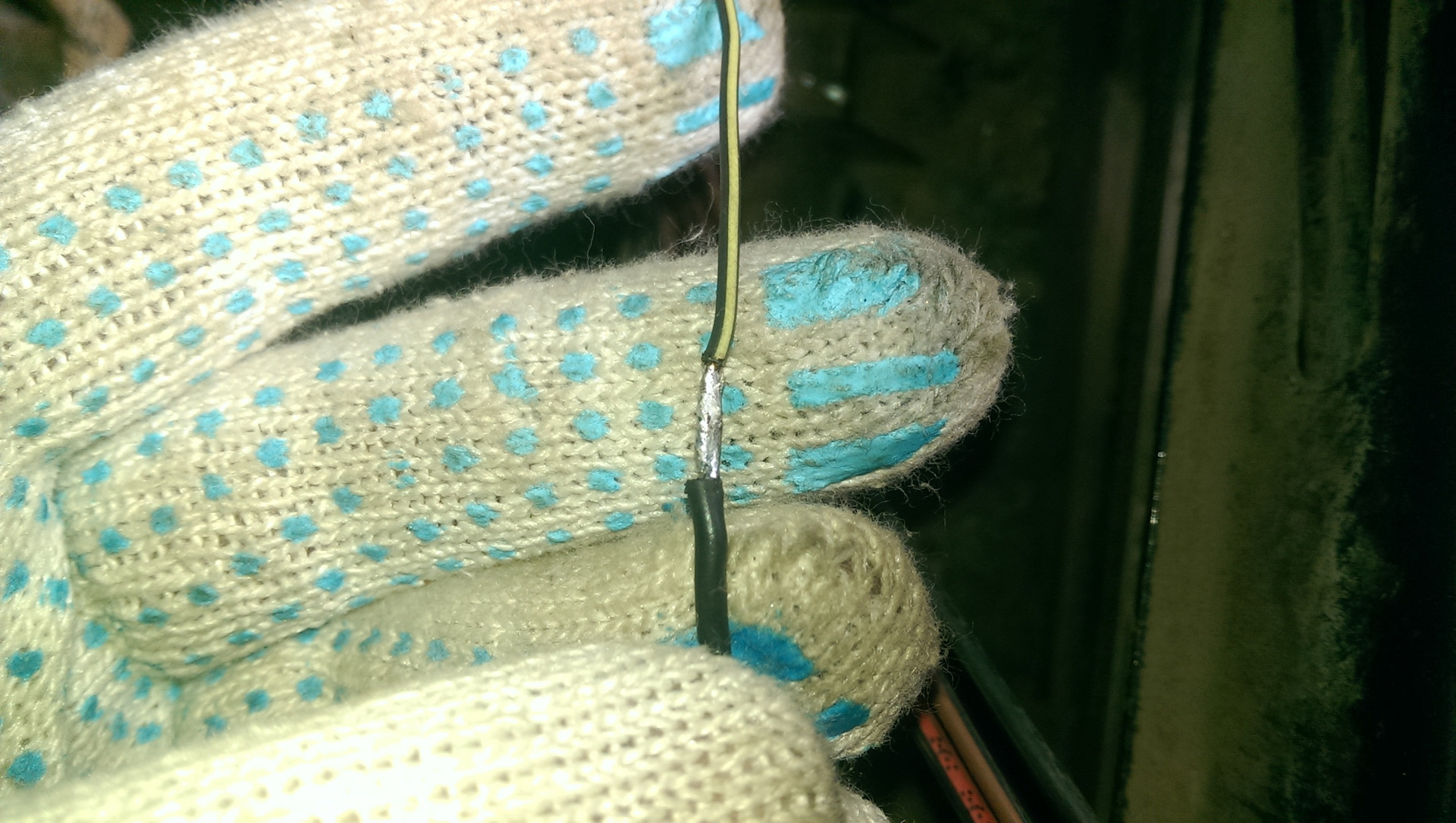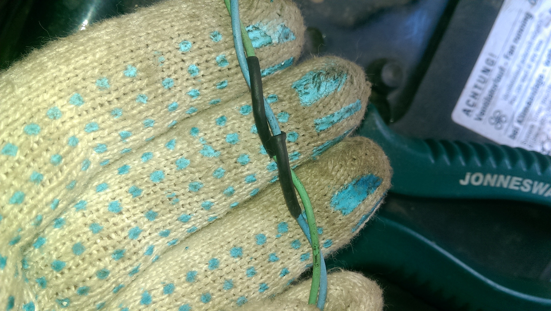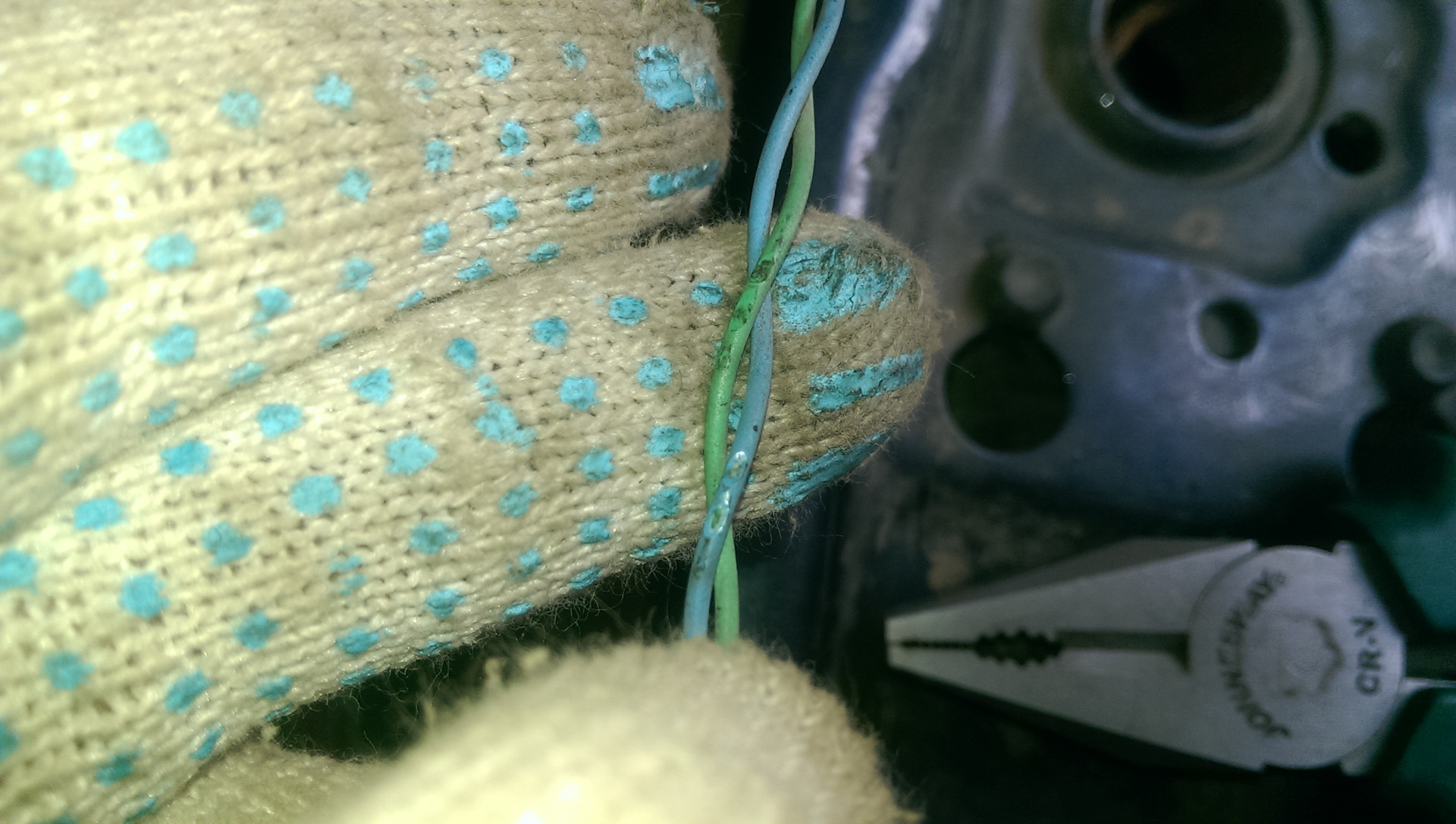 осмотр косы показал потертости до медных жил на коричнево-синем и желто-черном проводах, и несколько мелких потертостей