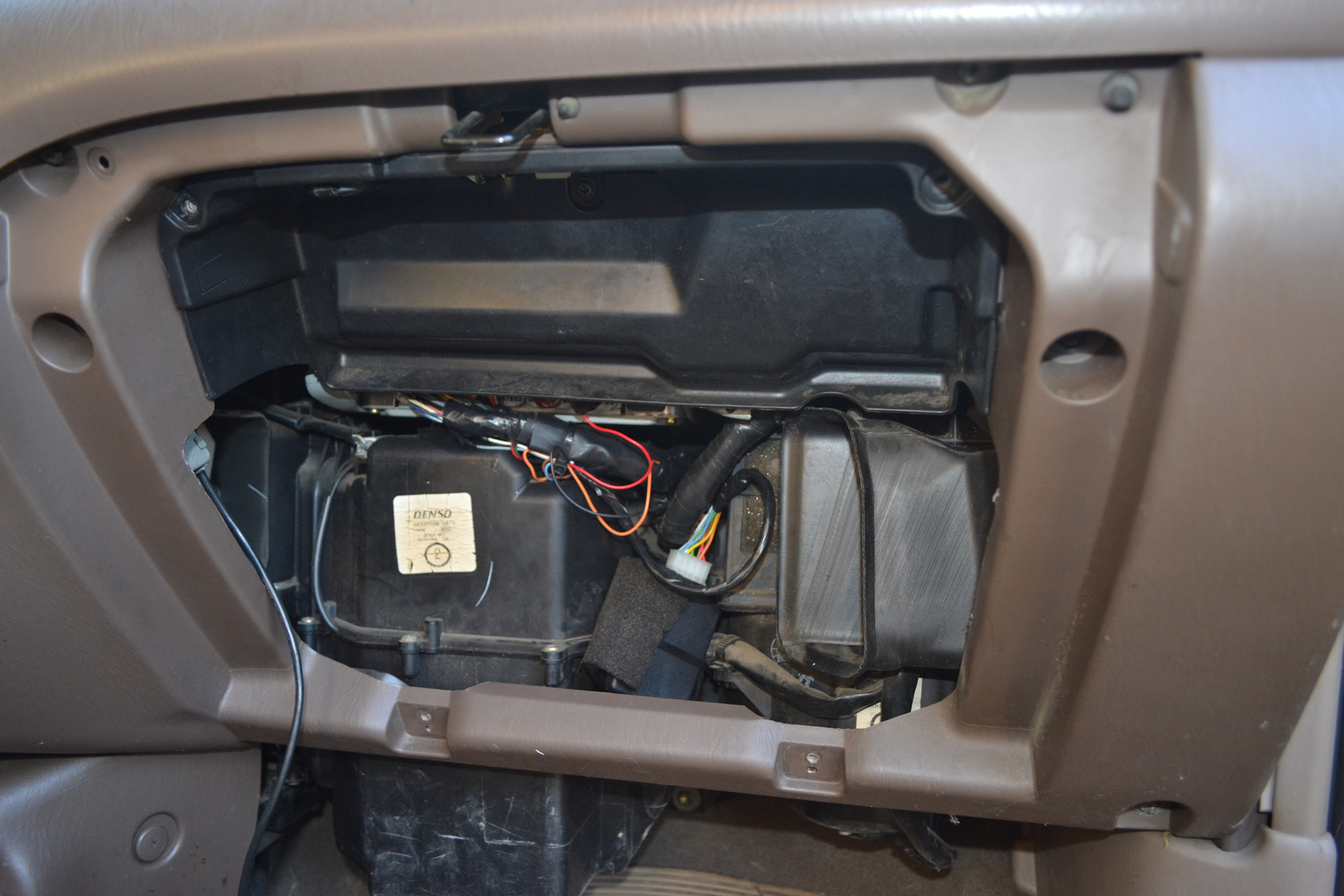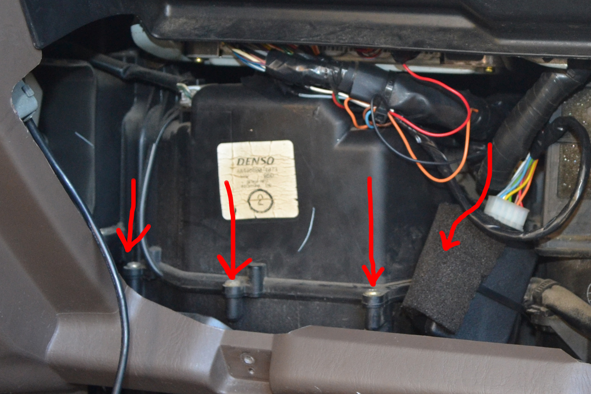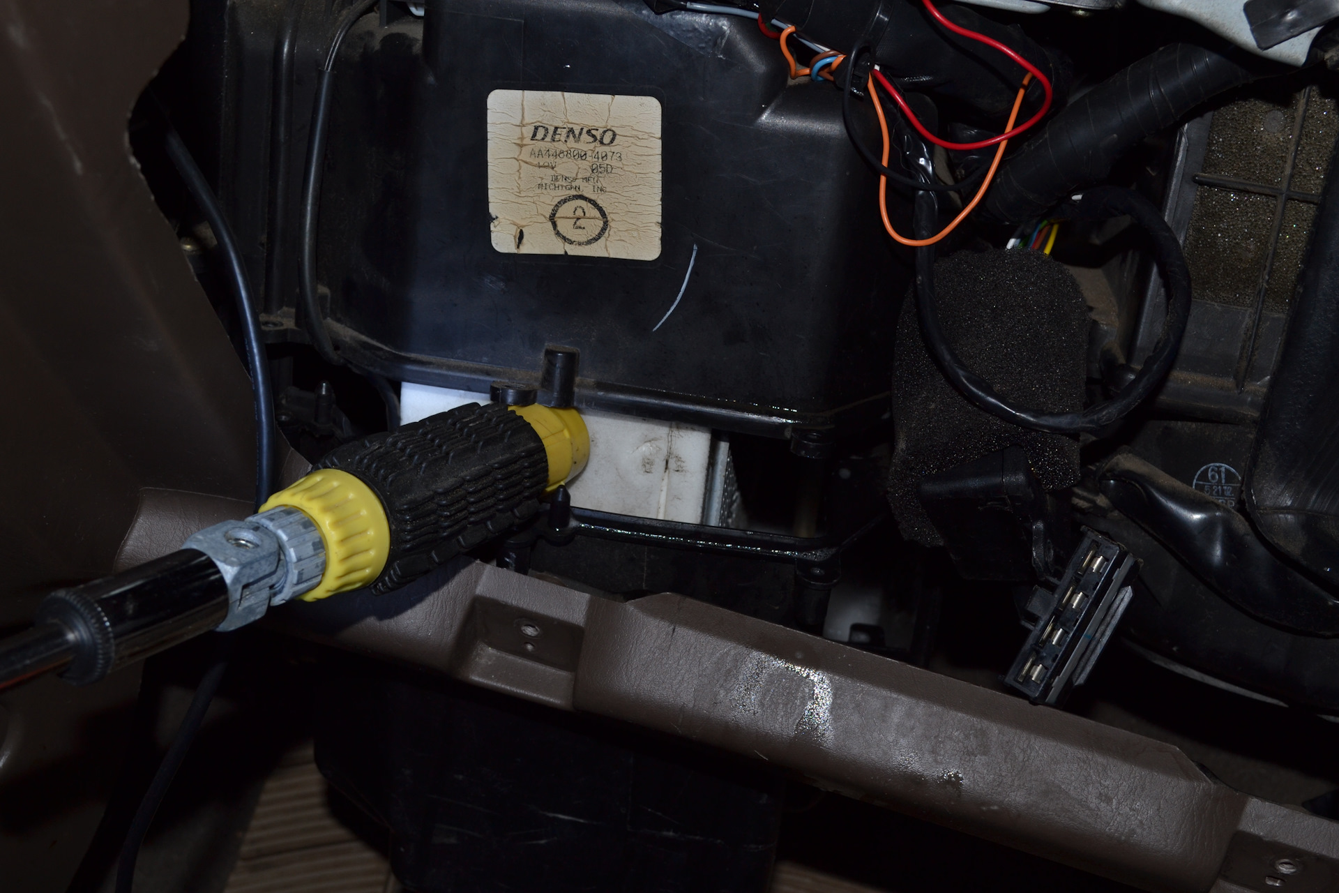 Затем я решил пойти на подвиг и открутить самое мерзкое, что могла придумать Тойота — 4 самореза крепящих нижнюю часть кожуха печки. Более неудобного действия сложно представить.