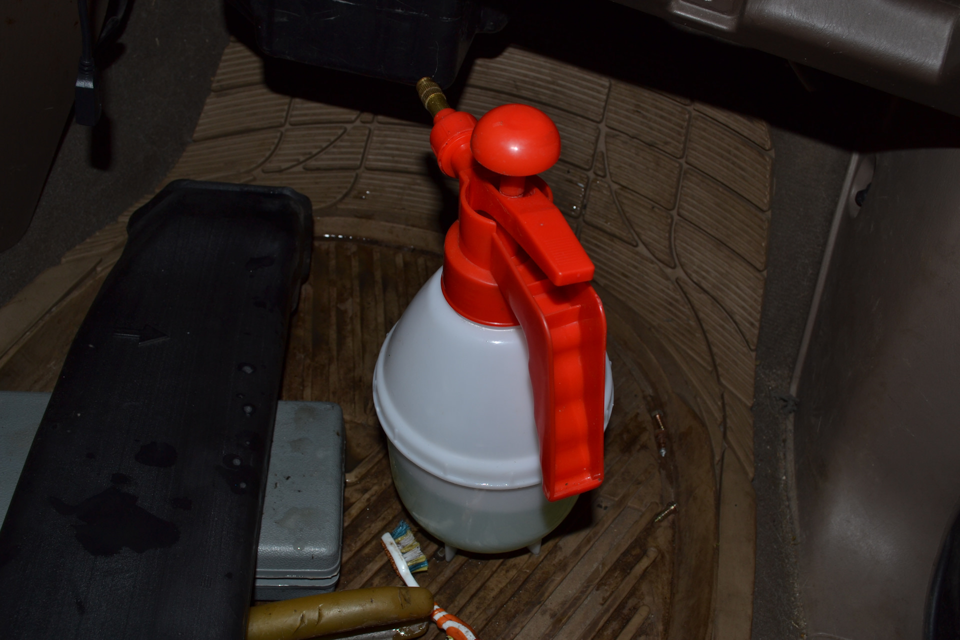 Далее, смастерив из зубной щетки вундервафлю, стал обильно поливать радиатор смесью из зеленой пены для мойки кузова Grass + первак 75% + вода. Вылил в разные отверстия полный опрыскиватель.