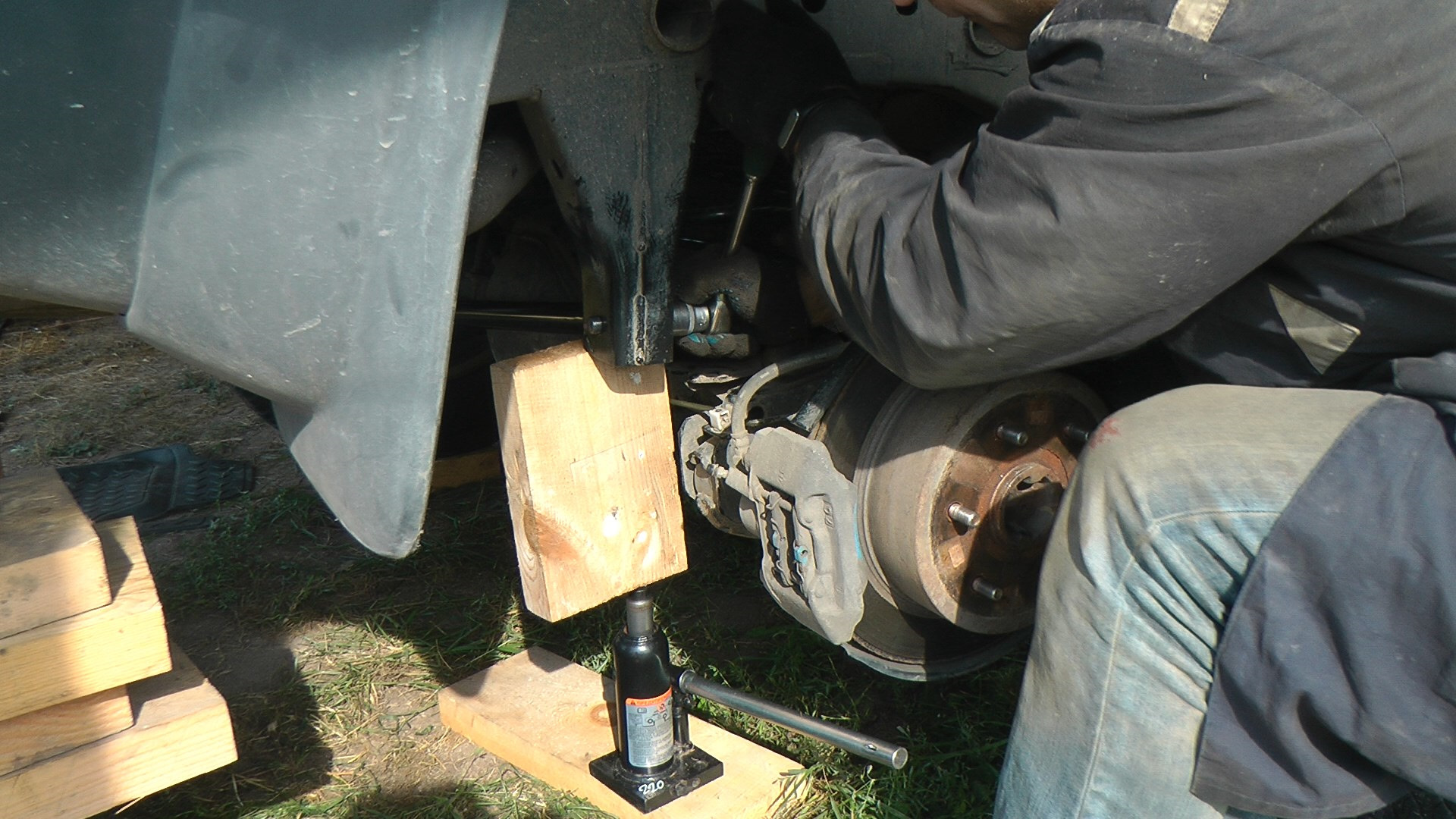 После подъема машины (домкратом за фаркоп) и размещения её на брусках (легко падает с домкрата вбок)