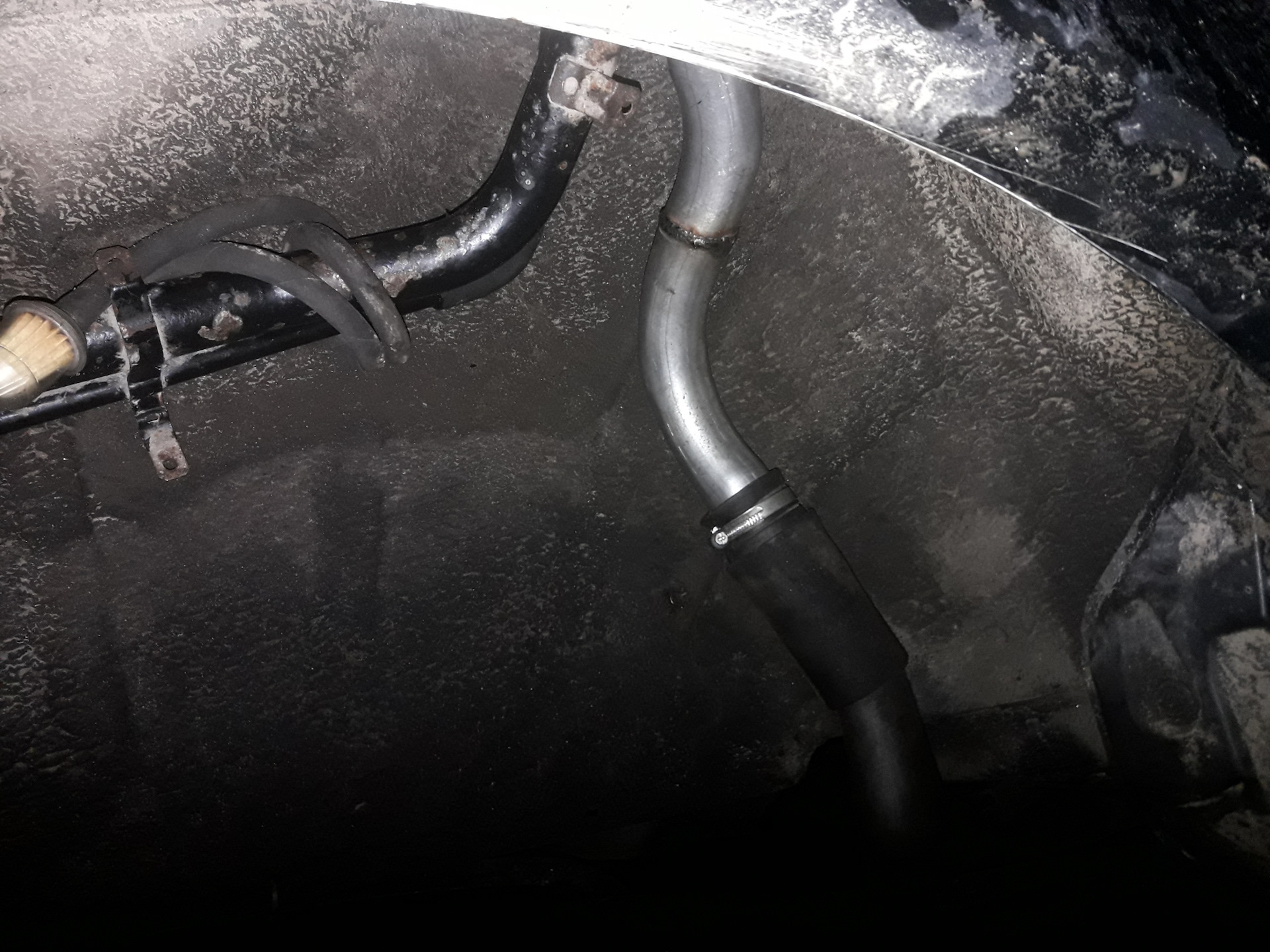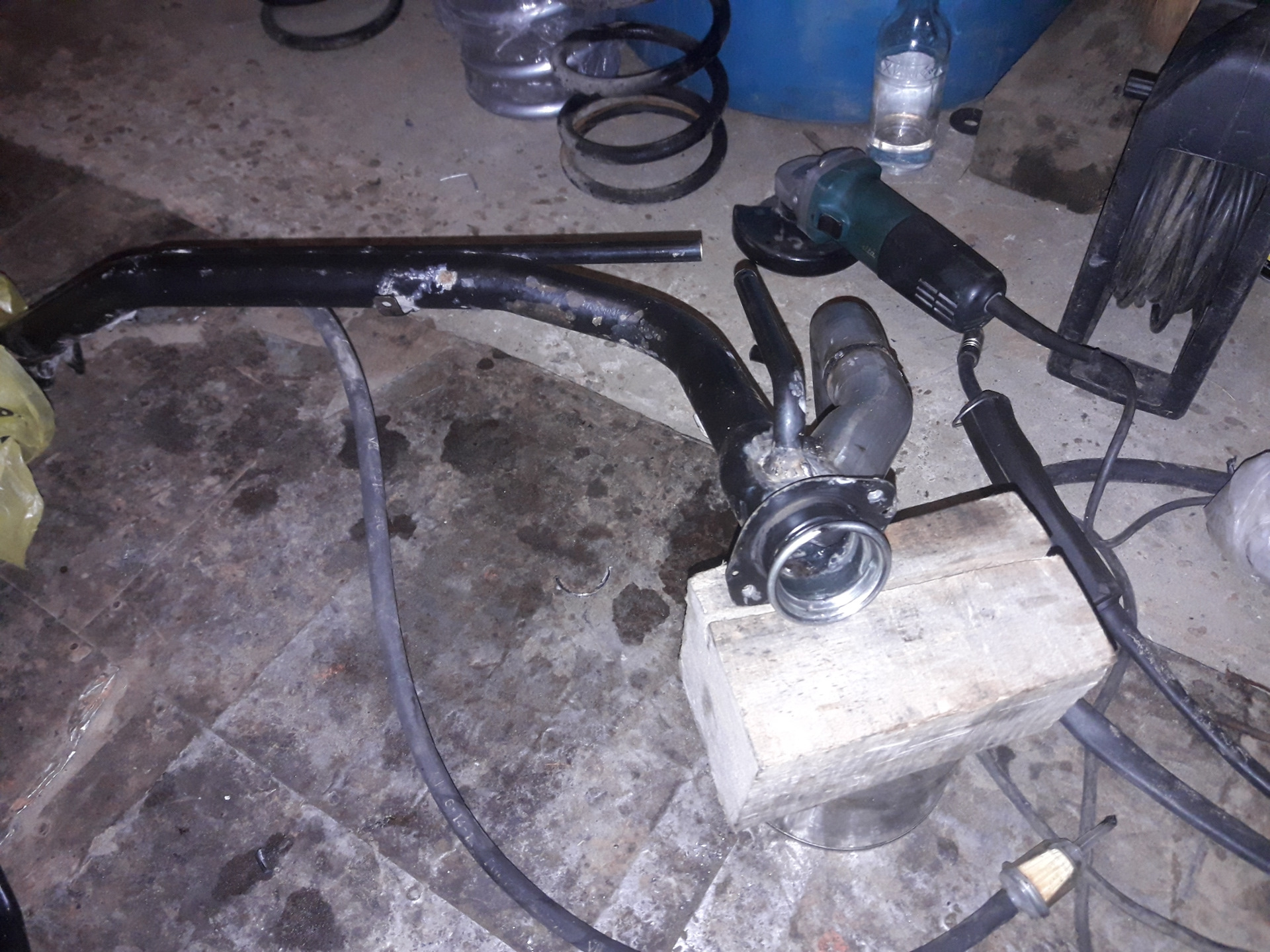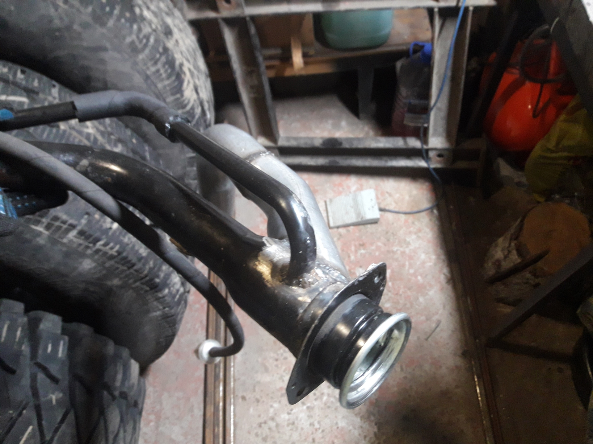 Из проволки согнул примерный путь новой заливной магистрали от заливной горловины до, патрубка бака. Затем обратился в контору автовыхлоп, они мне по образцу (по этой проволке) согнули обрезок трубы в нужных местах на нужный угол. Мне же оставалось только подогнать этот обрезок трубы по длине, сделать отверстие в родной горловине и сварить все это воедино, что я и сделал.