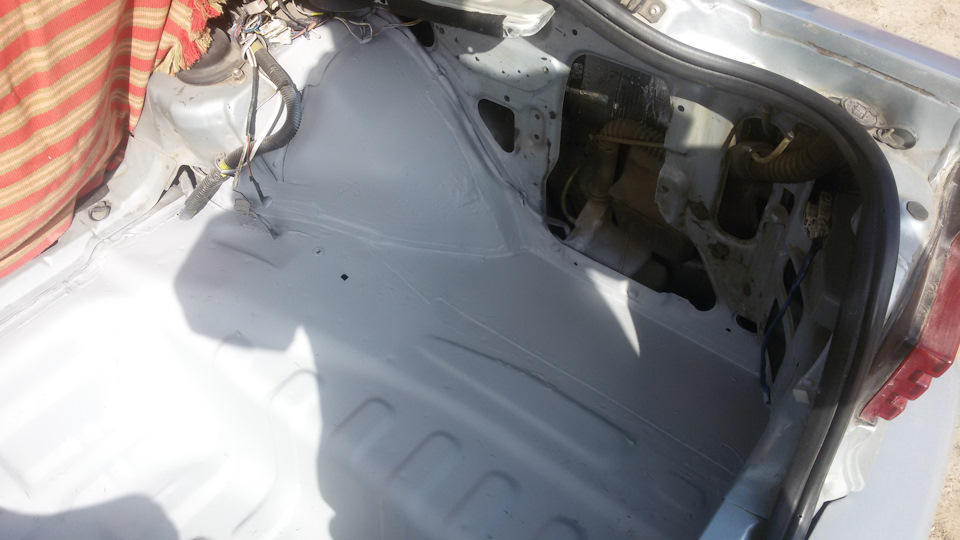 Всем привет. Всё что я не сделал по лету — это шумка багажника. Но в последние 2 недели на выходных я решил уделить этому процессу внимание. Поначалу всё очистил покрыл места ремонта кислотным грунтом, поверх акриловым и затем эпоксидным. На арки закатал бимаст бомб затем блэк тон 4 и оставшийся биппласт премиум 15мм для пробы 3-м слоем. Тазик закатан виброй стп аэро плюс, на этом и решил остановиться. Днище около тазика закатано аэро плюсом, блэк тон 4 и ниоз блок 2. Все карманы пролил раст стопом и сварочные швы промазаны шовным герметиком и пролиты раст стопом.