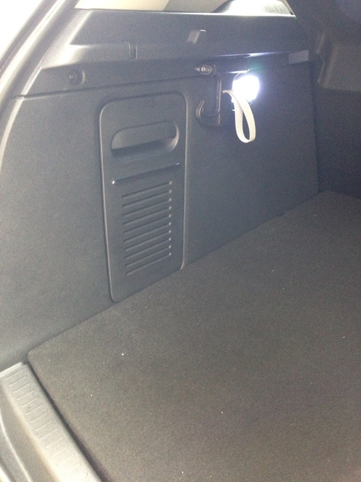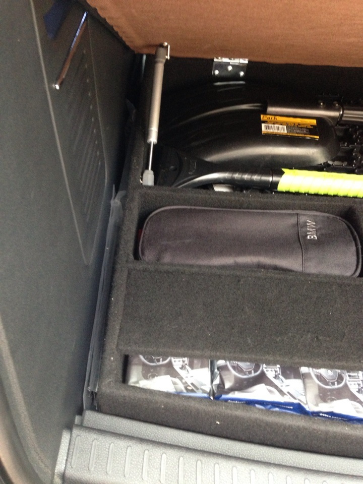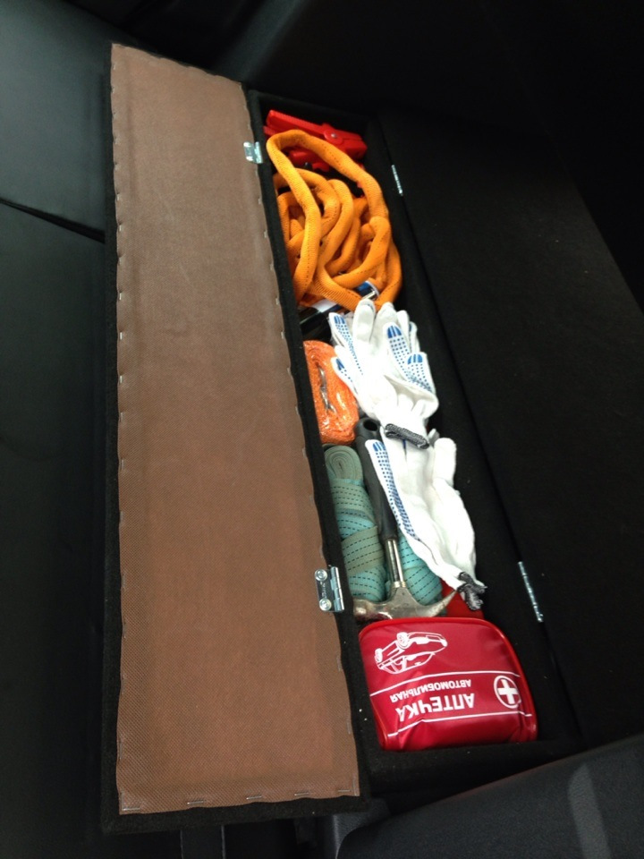 В боковых нишах багажника расположены огнетушитель, тряпки (замша/микрофибра) и компрессор для колес.