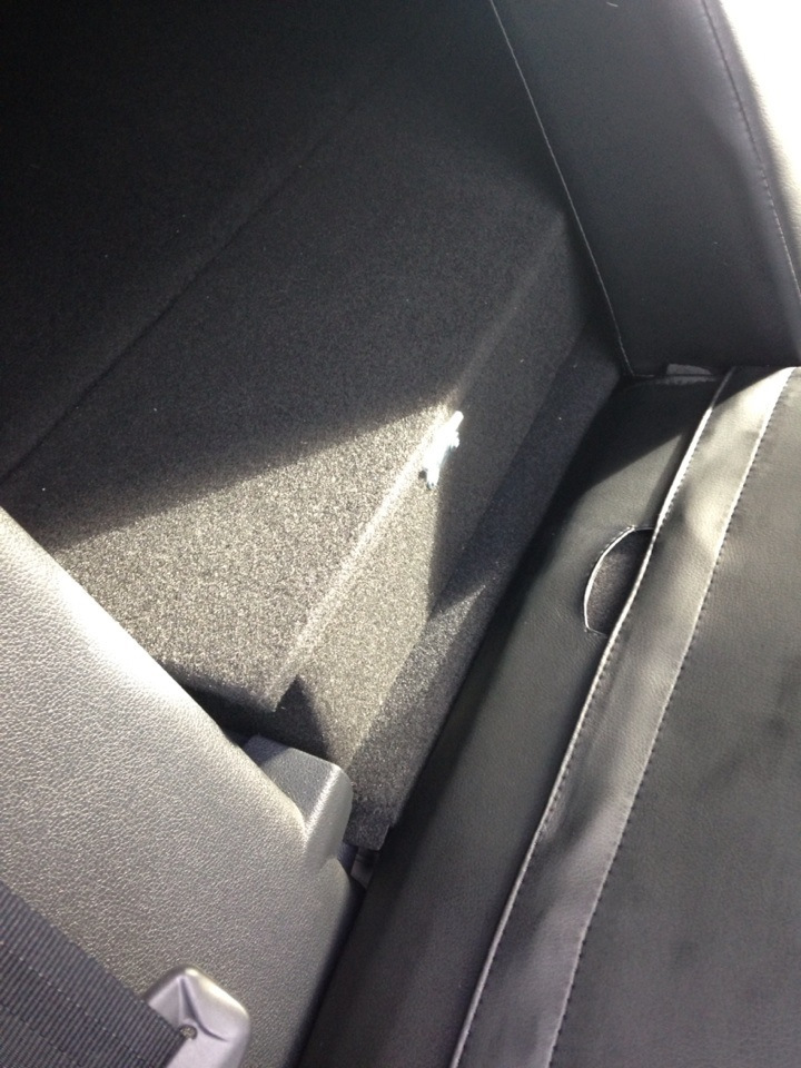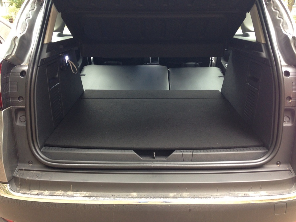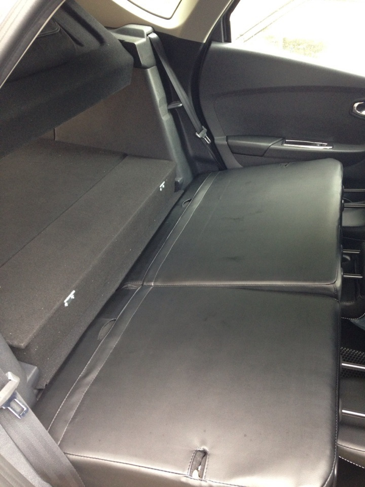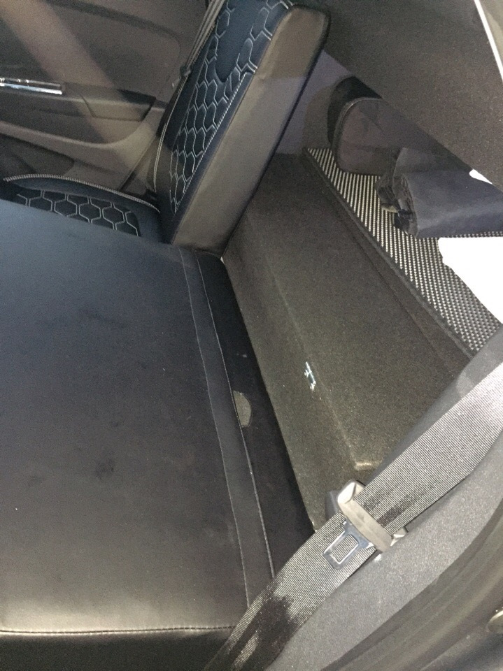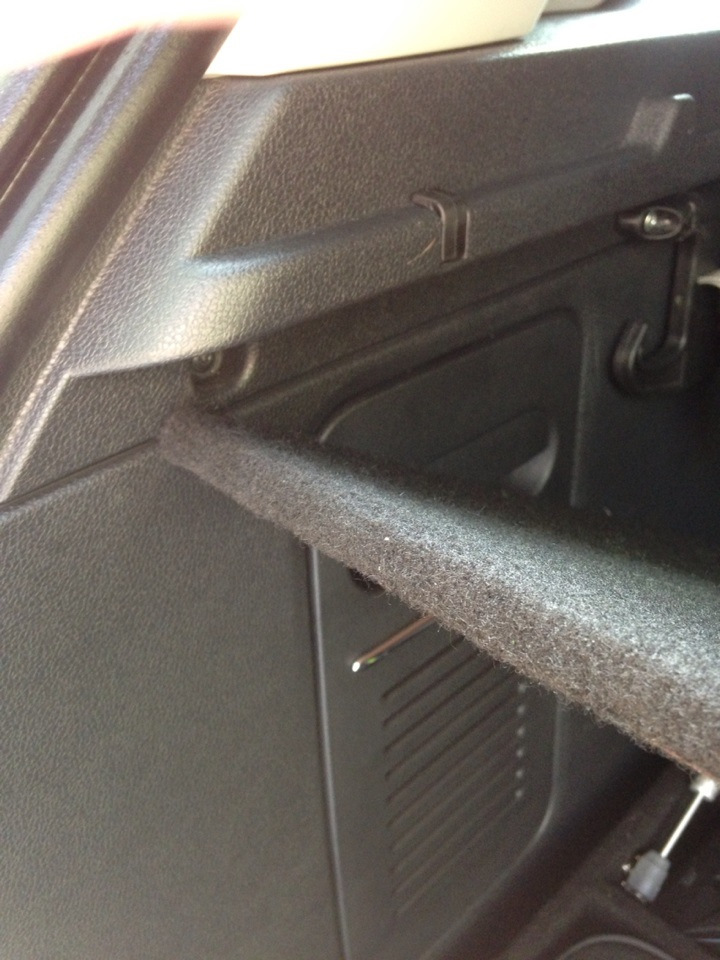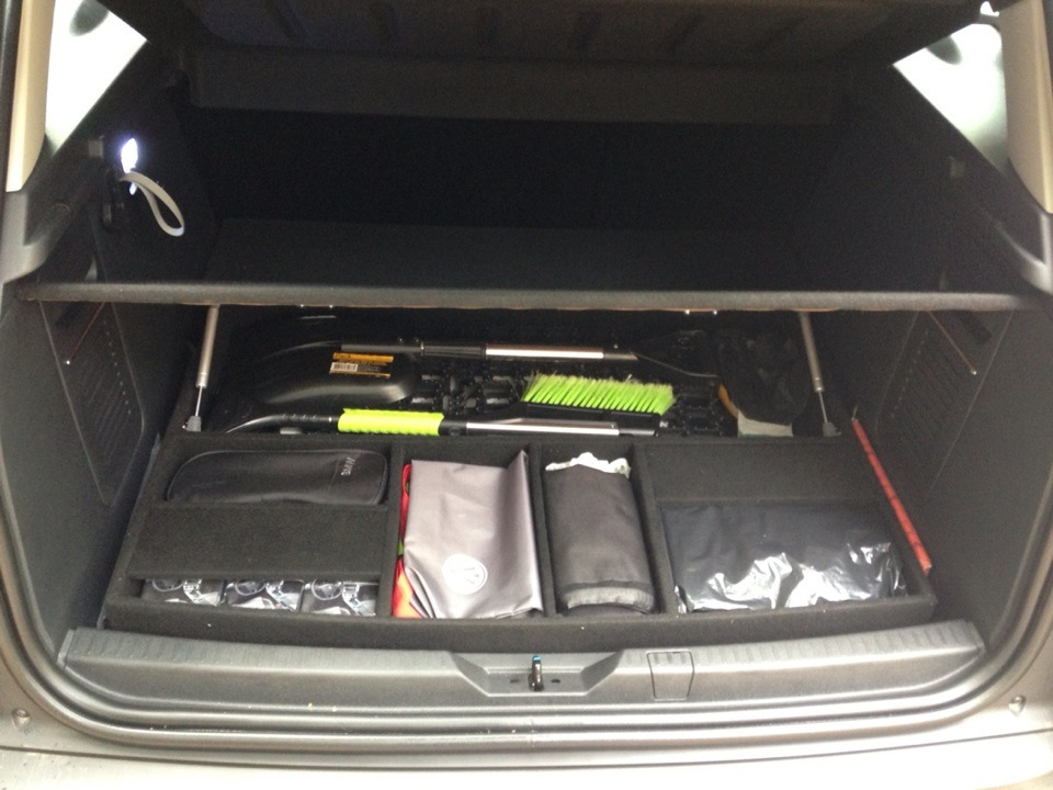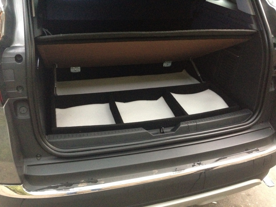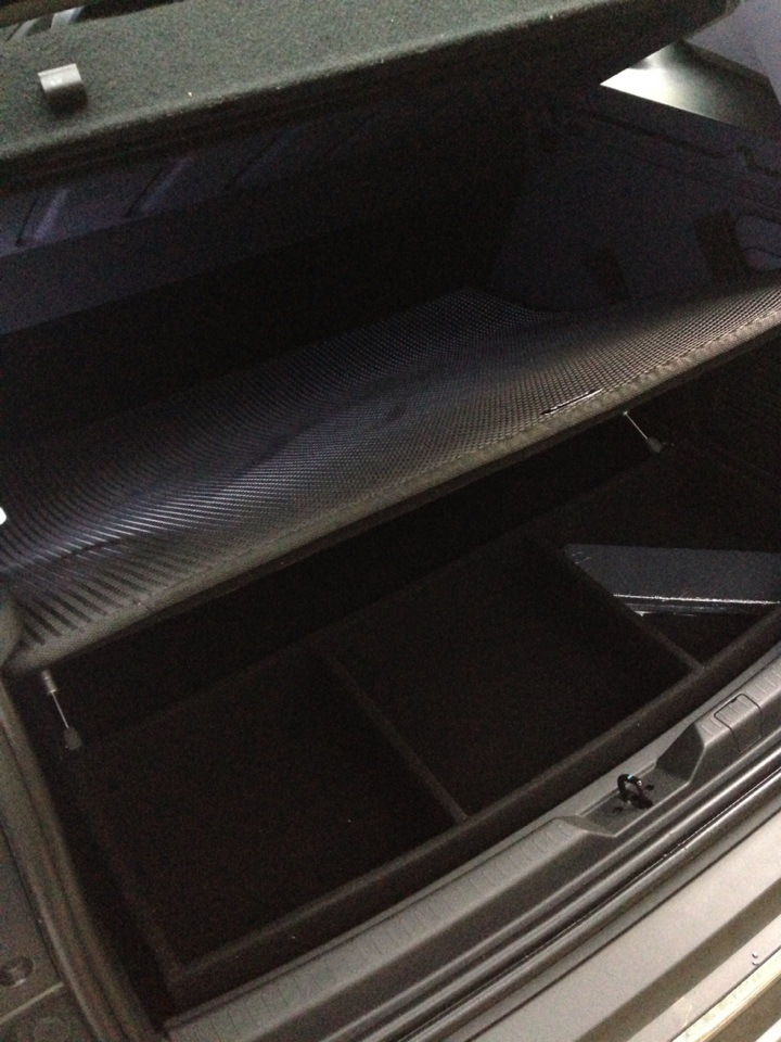 При раскладывании задних сидений есть ступенька из-за бокса, НО теперь она может быть барьером, чтобы из салона что-то не перекатывалось в багажник (при разложенных сидениях). Длинный твердые вещи будут лежать ровно, опираясь на верхнюю часть спинок задних сидений. Можно конечно заморочиться и убрать стандартный ковролин с ДВП, чтобы опустить заднюю часть бокса на 2-3 см, но тогда при раскладывании сидений будет открытая щель. Поэтому оставляем стандартный ковролин в багажнике и сверху просто кладем бокс-органайзер)