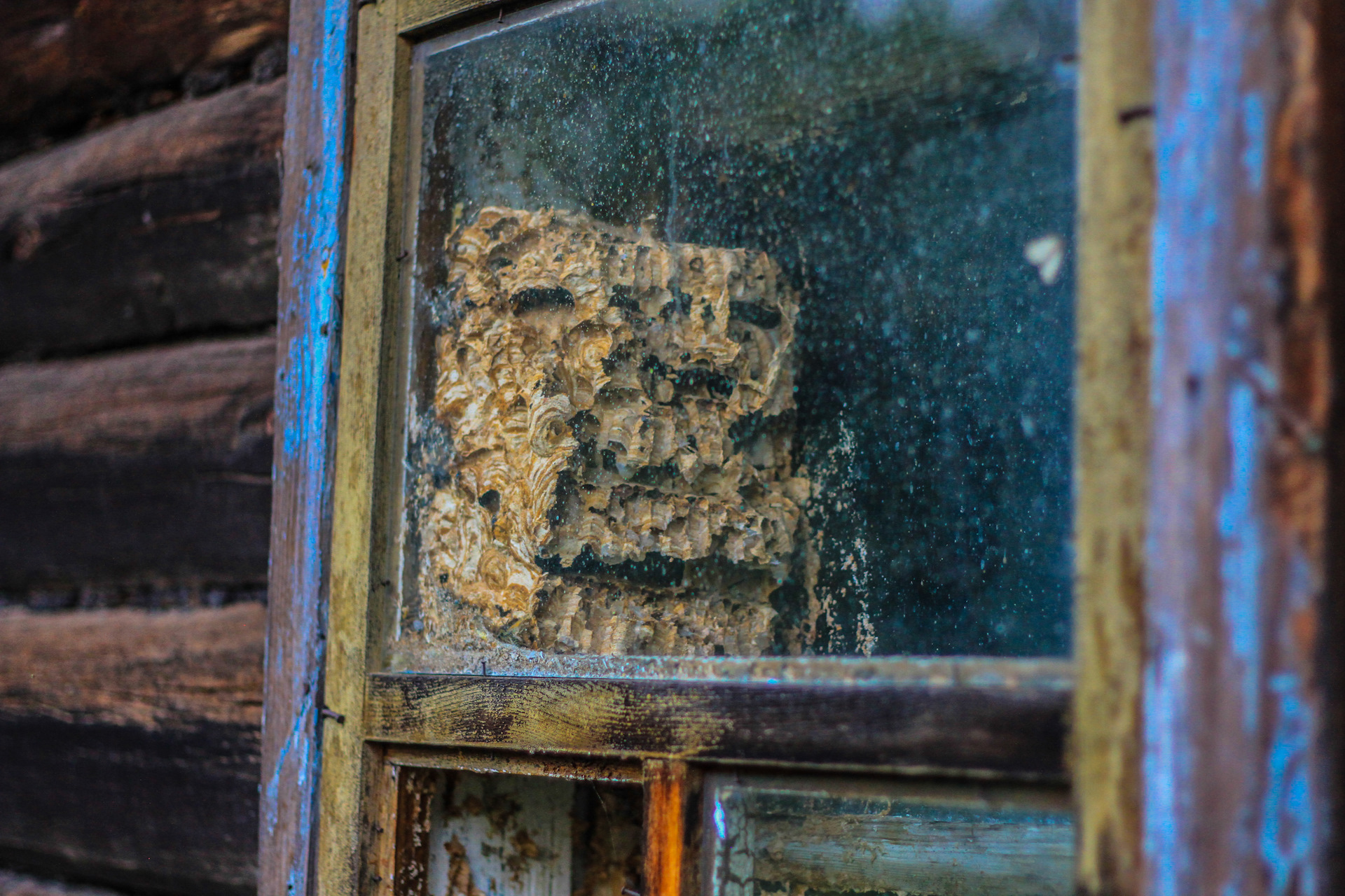 В этом же доме между стекол улей. Ни разу таких не видел. Осы?