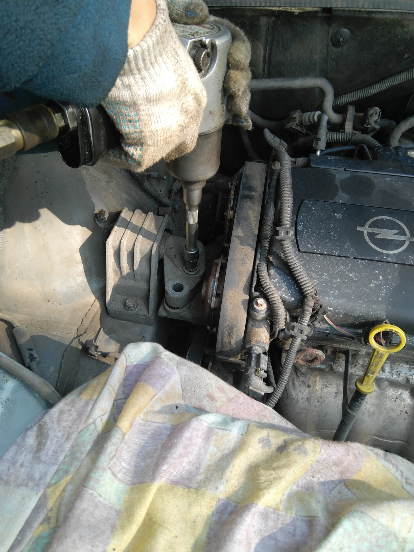 Снимаем защитный кожух ремня, подушку двигателя.