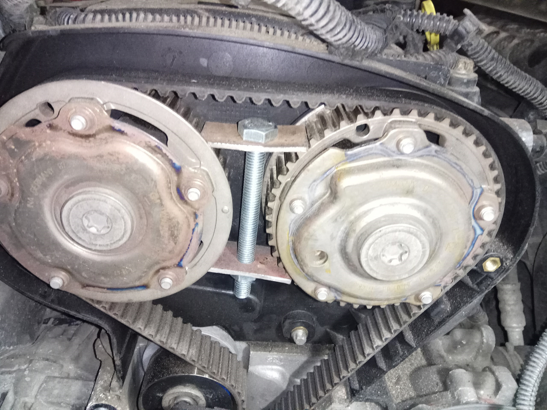 Шестерни, это регулятор фаз, они могут вращаться отдельно от валов. Я когда первый раз делал, довернул шестерни по меткам. И натянул ремень. А потом когда разобрал, прорези в которые встаёт эта пластина, совсем смещены были. На пару зубов даже кажется. В Ютубе видео есть, по замене ремня vk.com/video11126046_456239041.