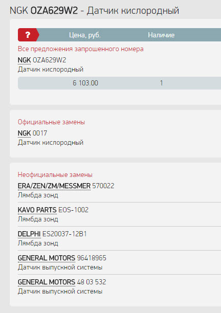 И вот -сегодня забрал, внутри упакован NTK OZA 629-W2 который на exist в заменителях с ценою в 2600 грн. К стати есть и второй оригинальный лямбда, тот что после катализатора 96418970 с ценой в 760 грн.Так же тот же Bosh 0258986507 как типа унивесальный(с пайкой проводов, что не рекомендуется) стоит больше тысячи там же.