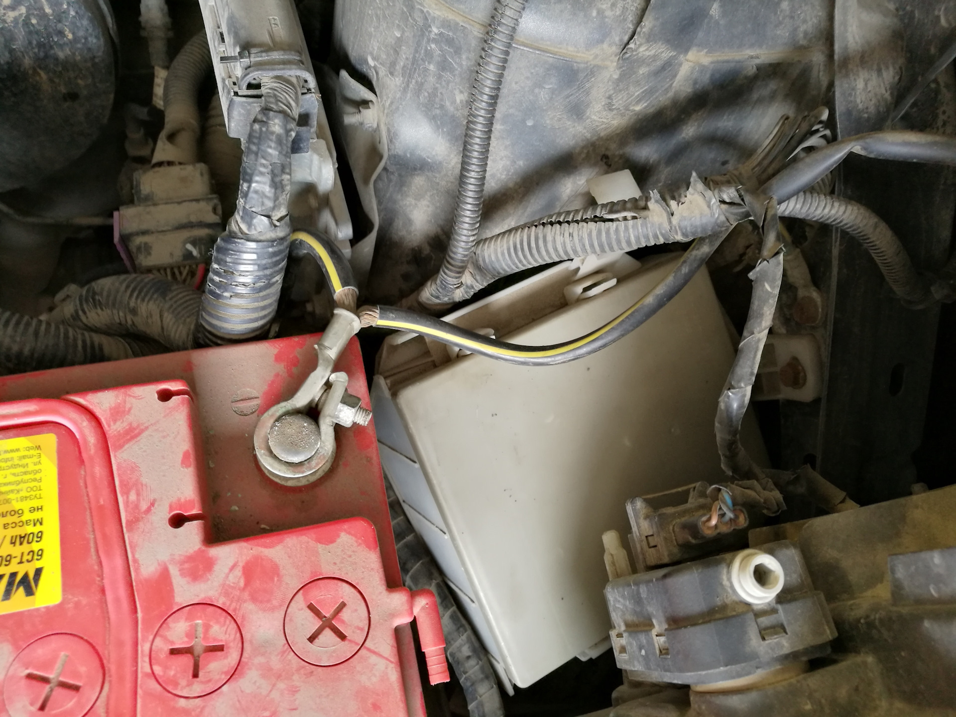 Для этого, откручиваем два болта сверху, один из них будет под жгутом проводов, провода отгибаем и откручиваем второй болт. После чего из ямы откручиваем два болта сбоку прямо под площадкой АКБ, их достаточно просто ослабить.