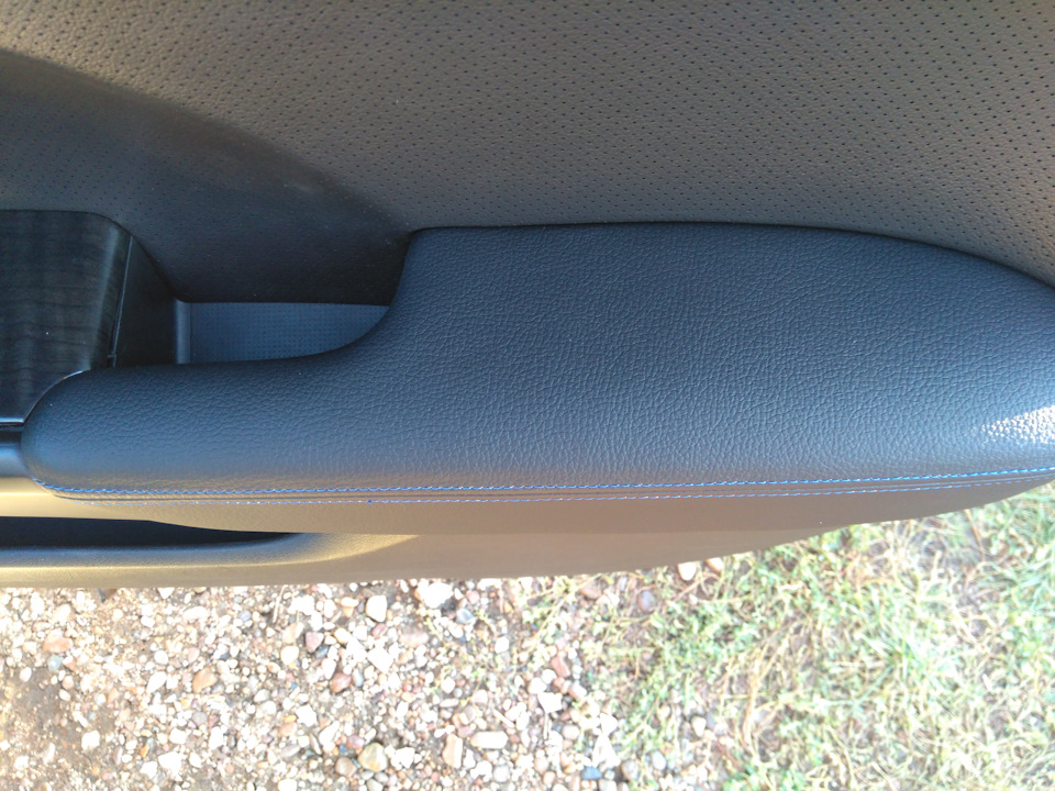 Подобрал кожу текстурой похожей на родную. Прошили синими нитками.