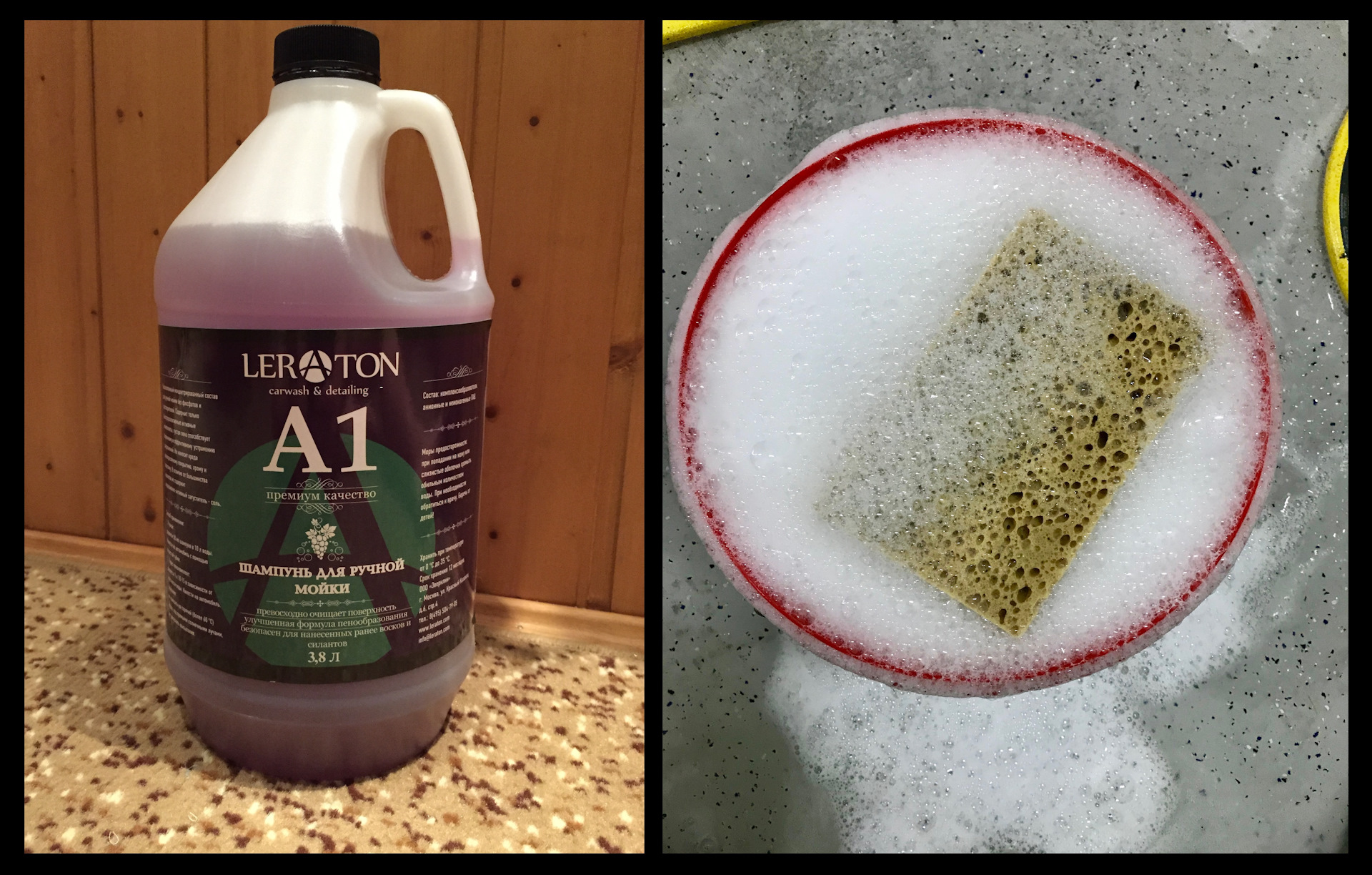 1. Leraton A1 (простой) – фиолетового цвета, отдаленный запах винограда, обильно пенится, скольжение обычное (чем больше смоченнее губка, тем лучше), стоит недорого, нормальные моющие способности.