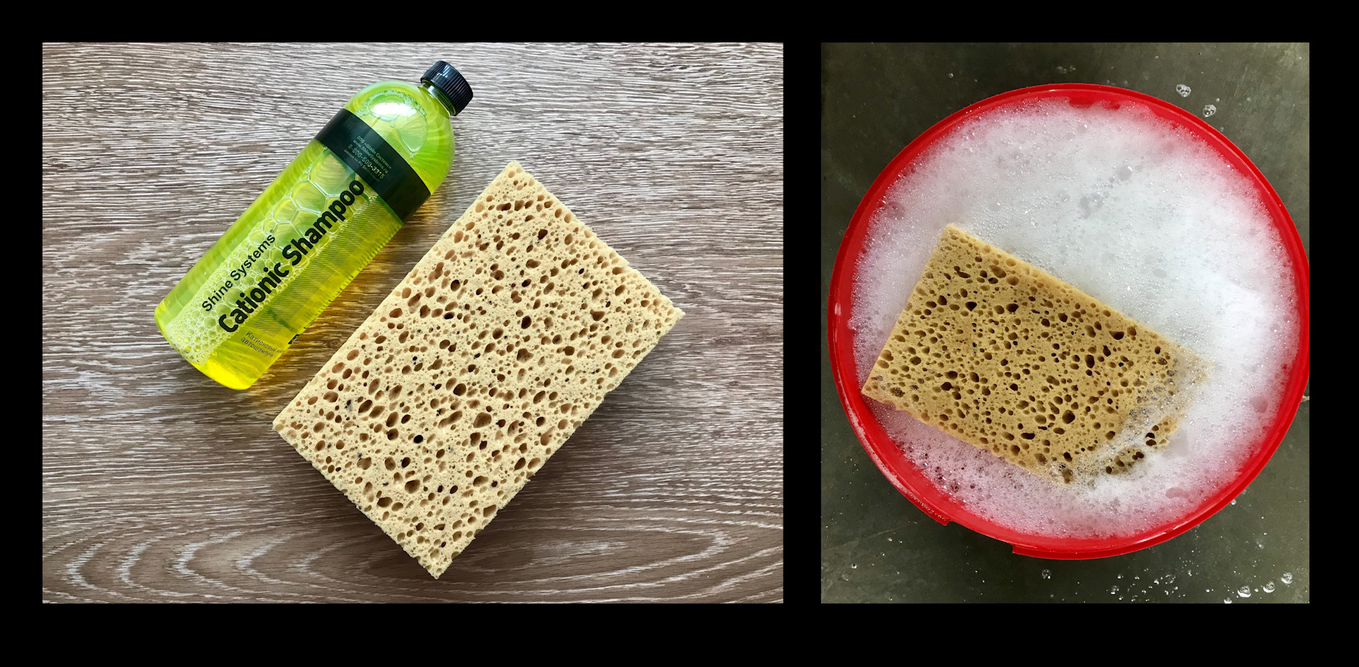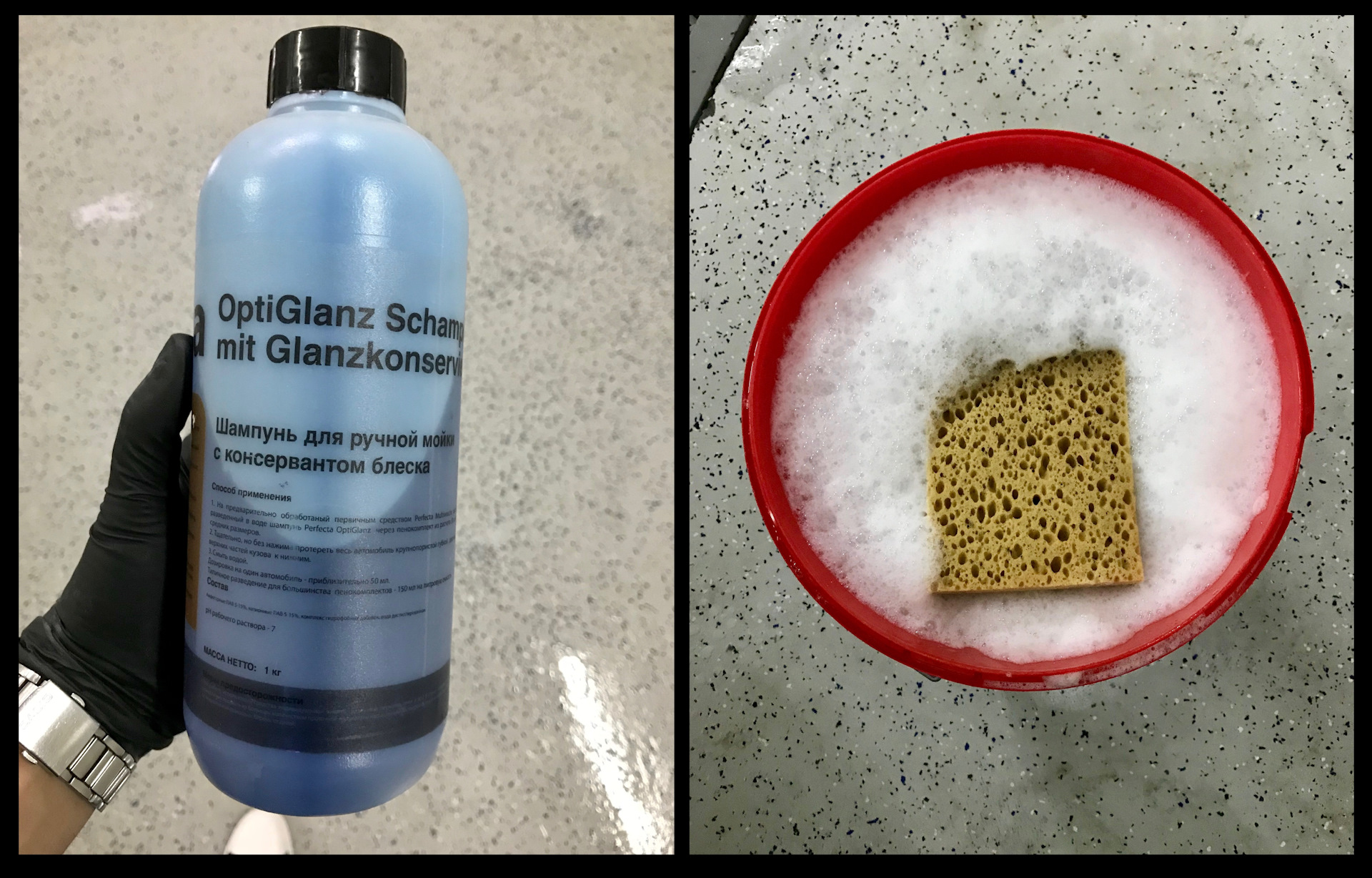 Все используемые ручные шампуни разводились и использовались вёдерным методом с использованием губок WASCHSCHWAMM Koch Chemie. Одной губкой, для верхней части кузова (крашенные части), моется таким образом, начиная от верхних частей и заканчивая нижними.
