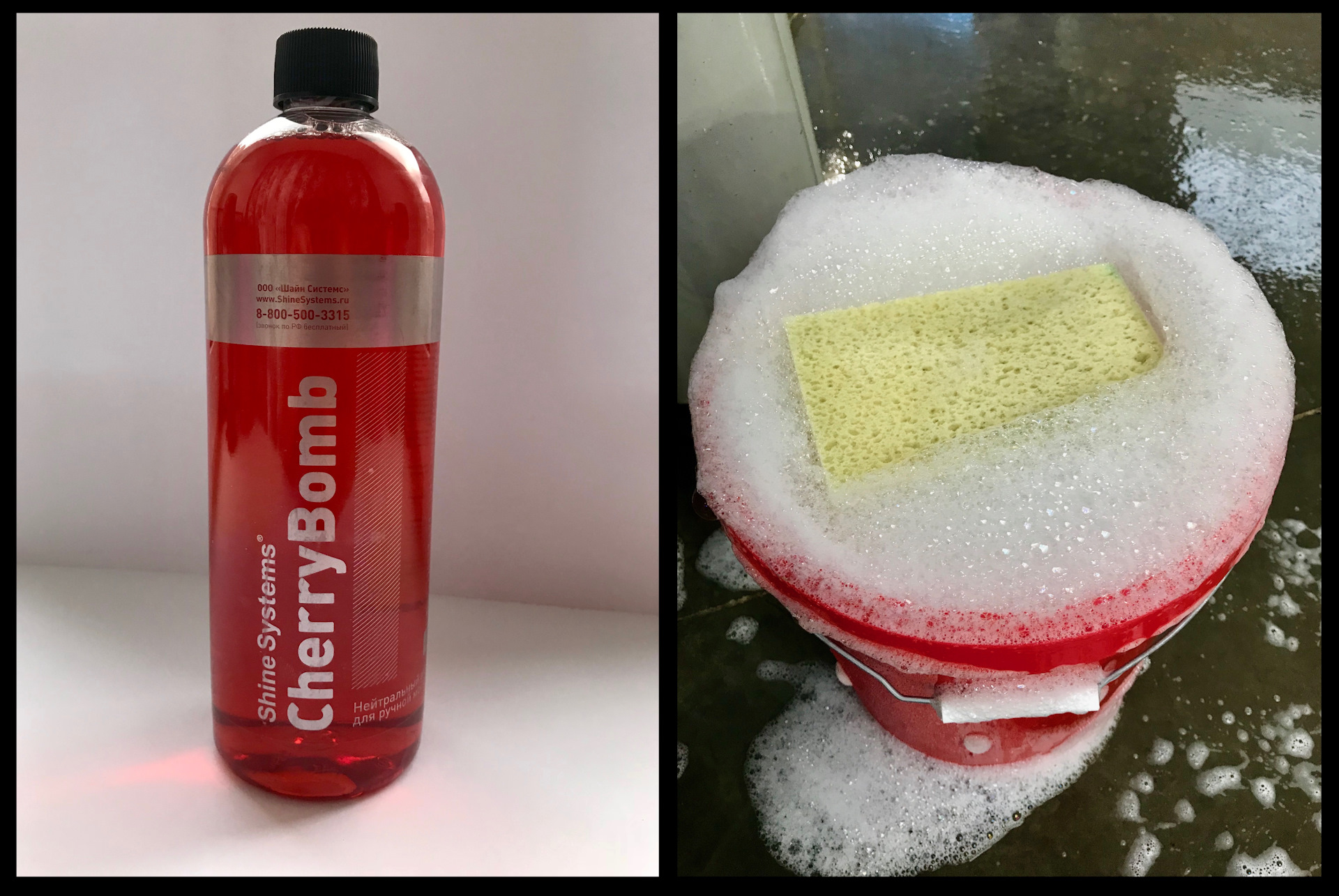 2. Cherry Bomb Shine Systems (простой) – красного цвета, шикарный стойкий запах вишни, обильно пенится, скольжение обычное (чем больше смоченнее губка, тем лучше), стоит недорого, нормальные моющие способности.