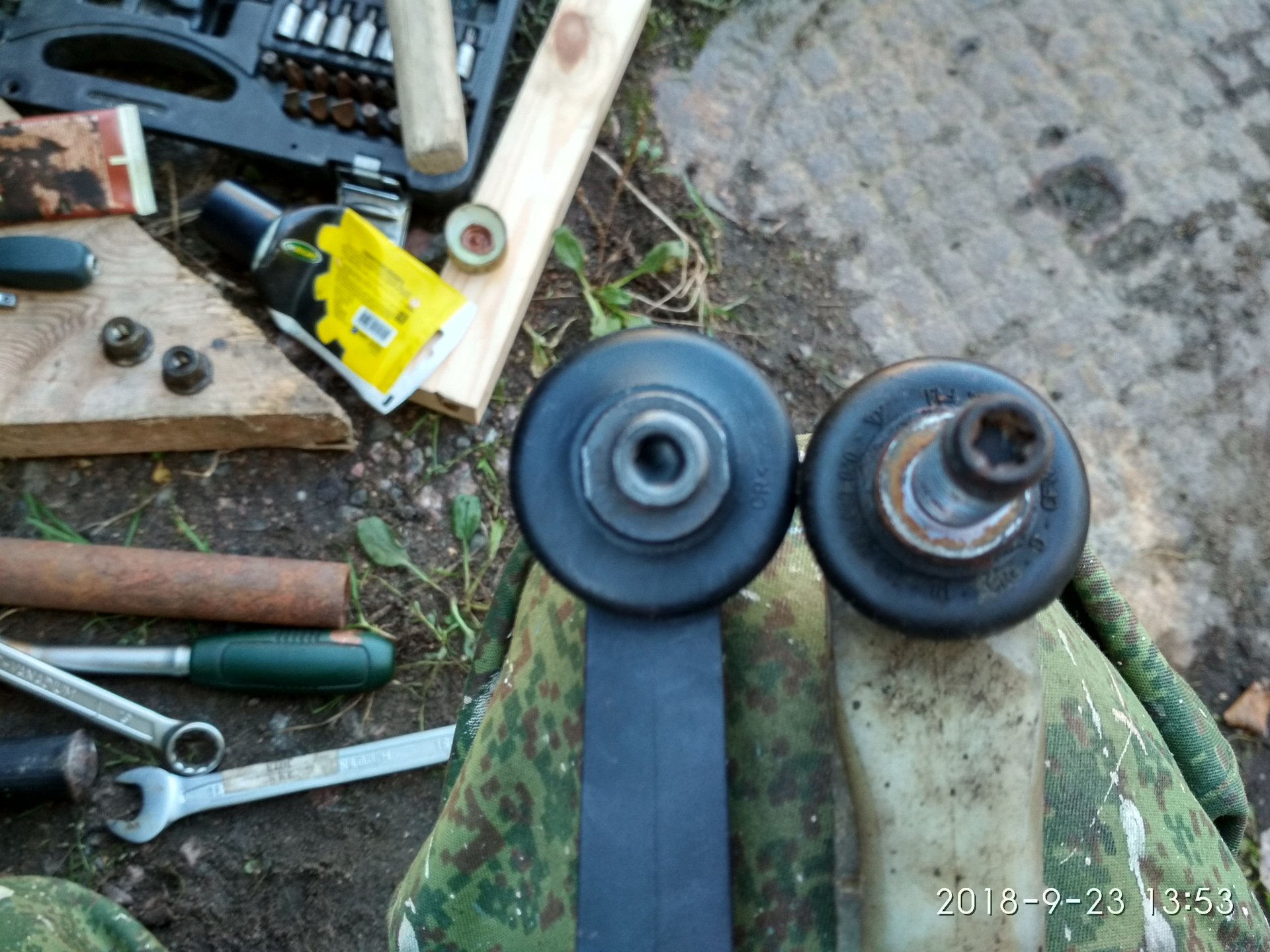 После этого уже протянул гайки сайлентов. Хочу, кстати, отметить, что на новых болтах гайки тоже идут ни разу не легко, все пришлось ключиками крутить. Насчет ключей: нужны и на 18, и на 19. Я очень порадовался, что у меня в двух экземплярах и головки, и рожковые этих размеров оказались. С передком вроде все. Поставил колеса, убедился, что правая сторона (там, где полуось выпадала) нормально вращается, проехался, вернулся и приступил к филейной части авто.