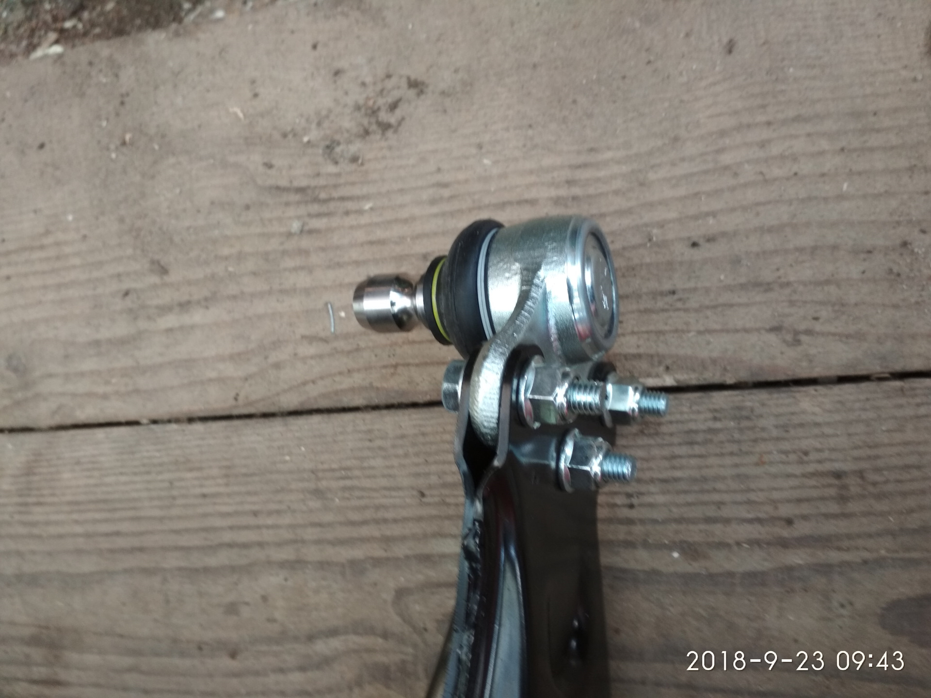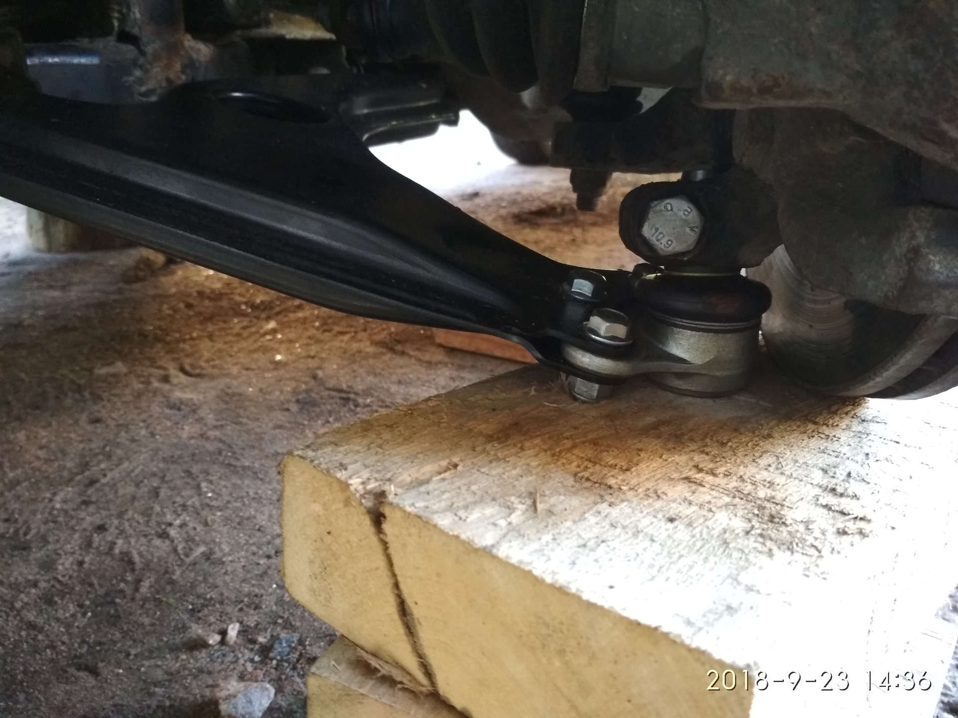 Сама операция больших сложностей не вызвала, но времени все-таки весь процесс занял довольно много. Поднял перед машины, сбросил колеса, обильно попшикал вэдэхой все задействуемые резьбы. Пошел ящики для кроватки детской доделал (кому интересно, пожалуйте в блог) и начал откручивать. Гайка шаровой пошла достаточно легко, потом через деревянный брусок молотком слегка по рычагу постучал, и он из цапфы вышел. Вот с гайками сайлентов было тяжелее, они практически всю дорогу еле-еле тянулись с хрустами и скрипами, но кое-как отвинтил.