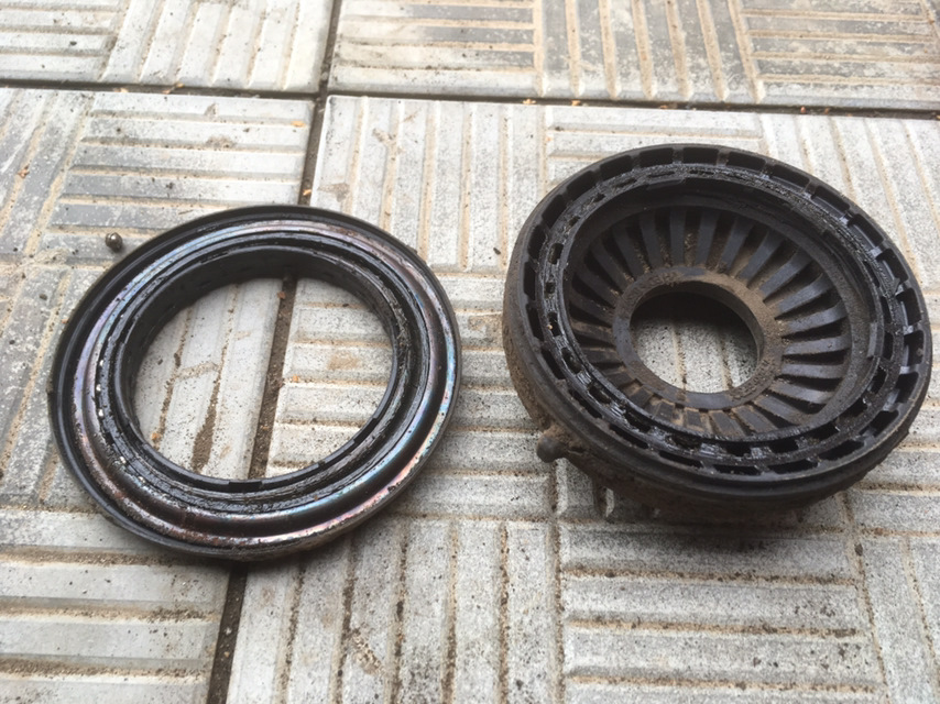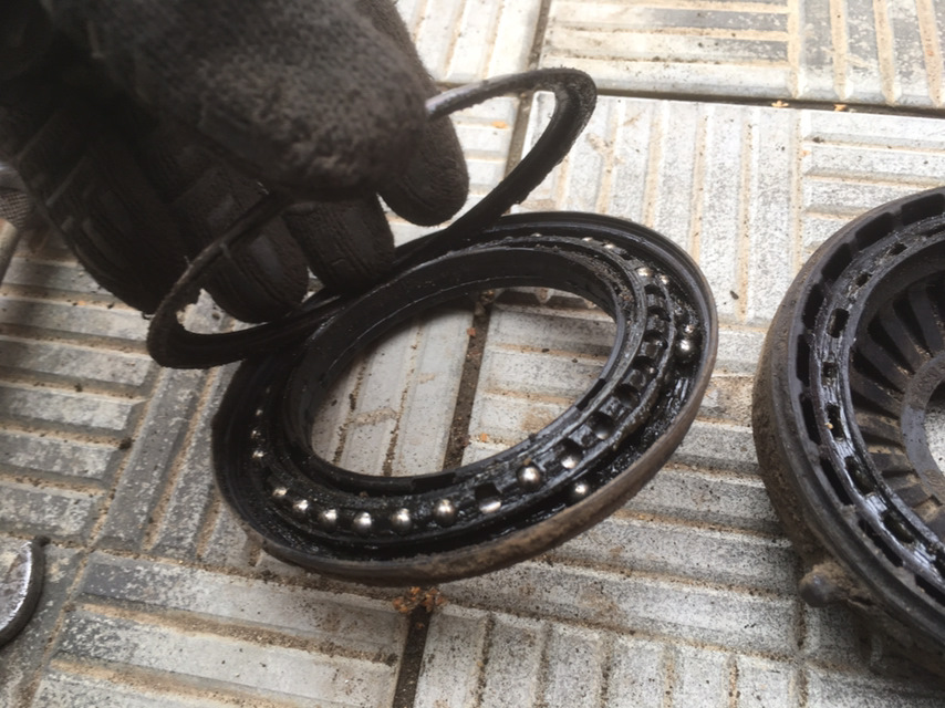 Далее, заметил что на поднятой машине по пружине идет вибрация, когда крутишь рулем. Думаю поменять что ли опорники в зиму, поехал купил skf. Левый рассыпался в руках, правый еще живой.