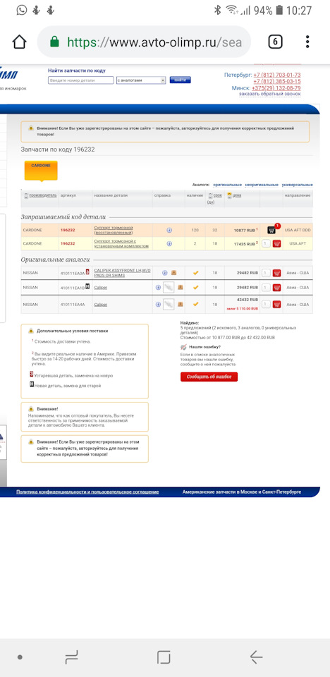 Сроки поставки конечно не маленькие, однако это типично для З\Ч из-за рубежа. Замечу, количество данных позиций, доступный на складе поставщика более чем достаточное, статистика выдачи отличная (практически нет отказов), рисков остаться без предоплаты на том-же Yulsun или Zzap нет никаких. В случае отказа поставщика клиенту просто возвращается предоплата, тут Вам не развод родом c Авито о просьбе внести половину стоимости перед отправкой комплекта тормозов из Владивостока в Москву, получив который горе-покупатель обнаруживает в посылке кирпичи).