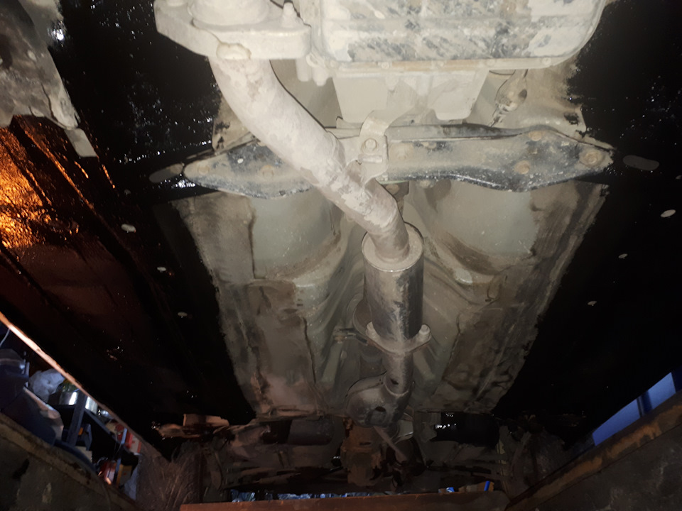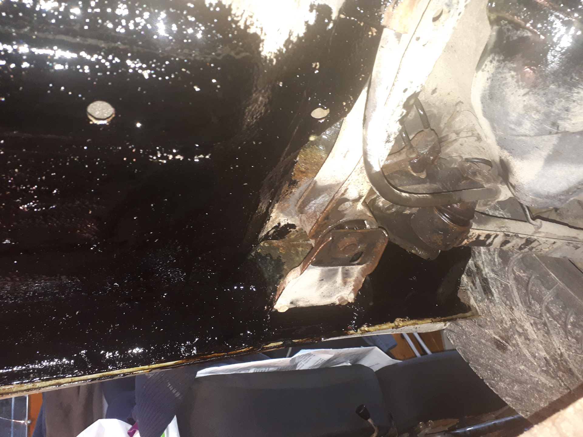 Процесс очень трудоемкий и не приятный, пригодятся и прозрачные очки, в глаза так и норовит попасть землица русская. Далее зачищенную поверхность на всякий случай я обезжирил для лучшего прилегания мастики. Мастик существует великое множество и резино-битумная и сланцевая и пушечное сало, но поскольку сланцевая подозрительно дешёвая, а сало я не люблю, взял резину-битум.Затем уже наносим мастику по периметру, а в трудно доступных местах я забрызгал мовилем и вот что получилось.