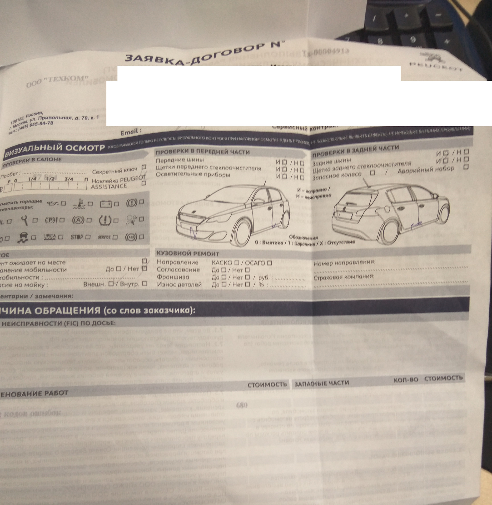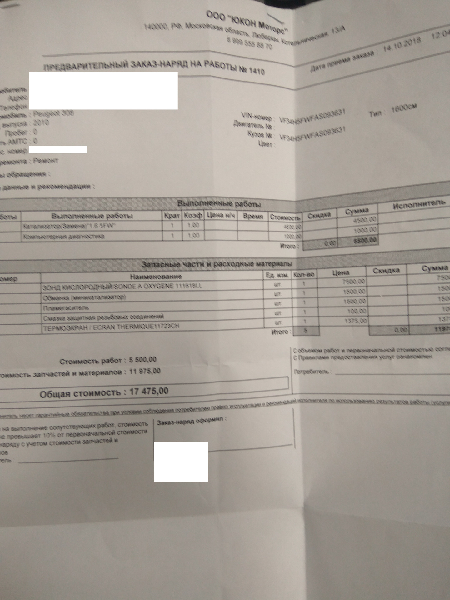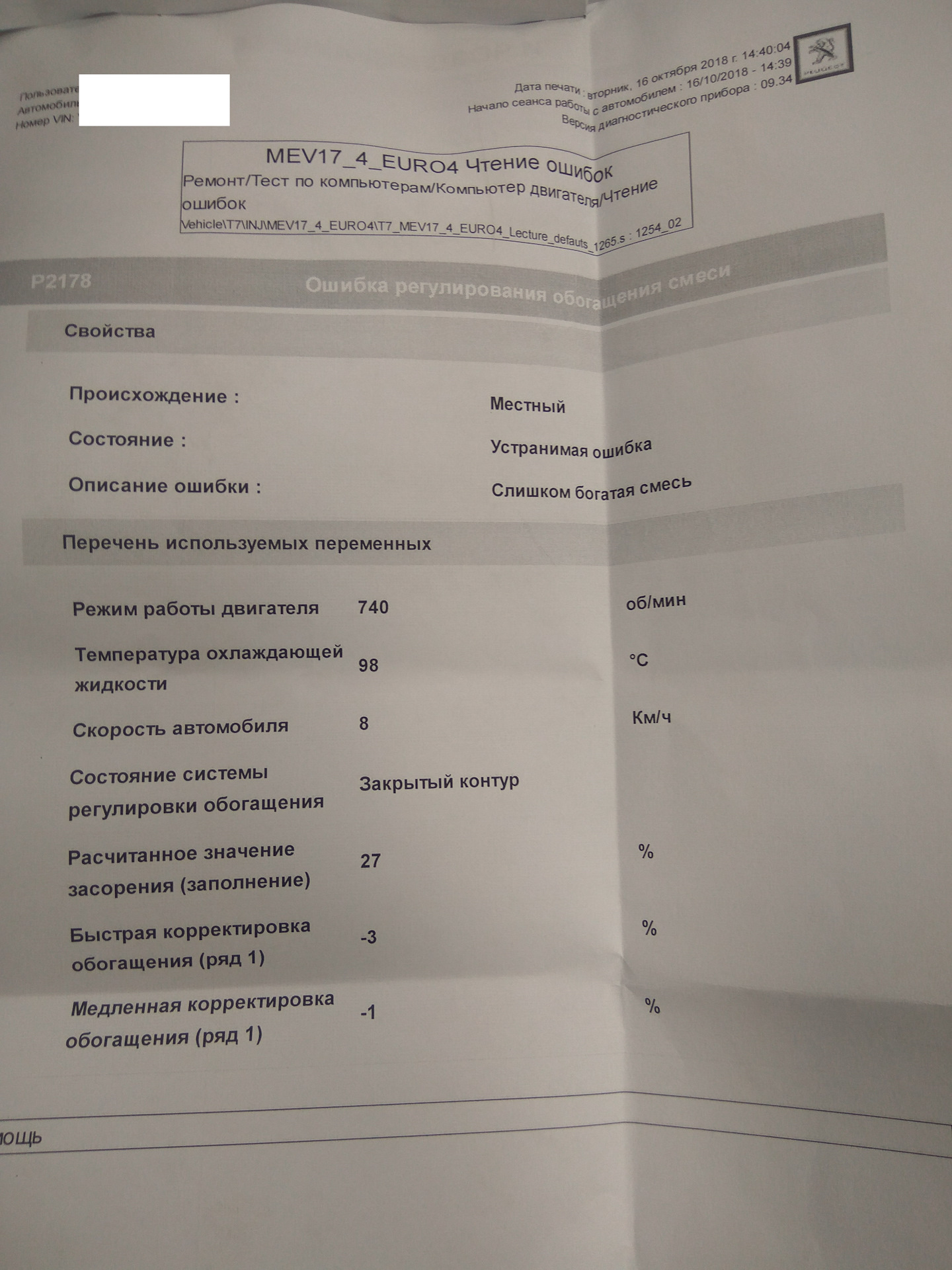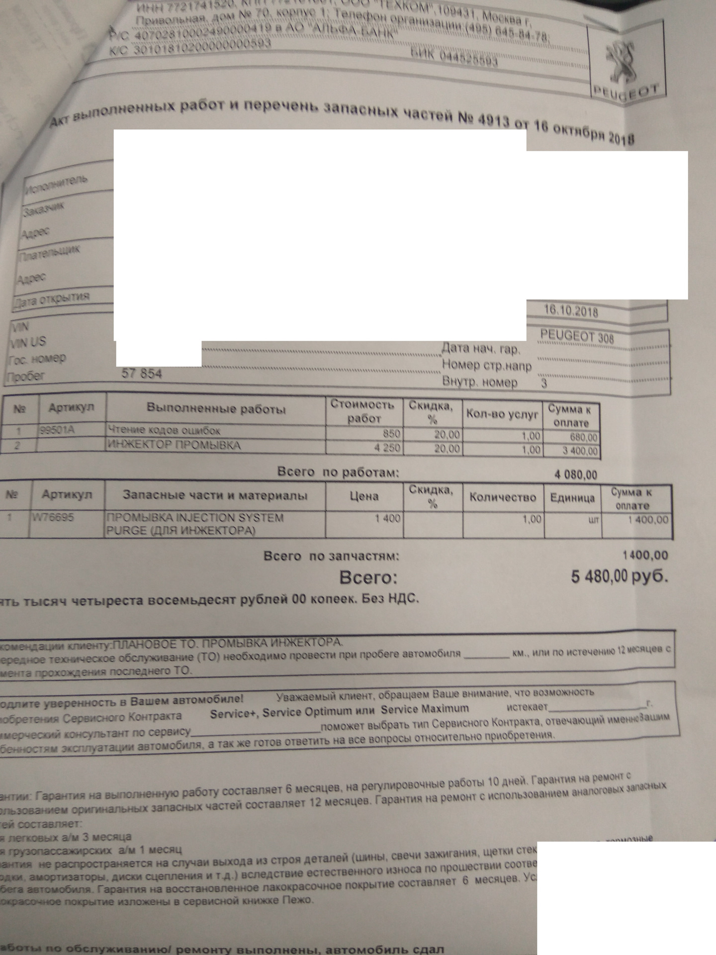 Отвели к руководству и начали считать. Мне говорят : смесь богатит, надо менять лямду, вырезать каталик, ставить обманку, пламегаситель и если ошибка не уйдет то еще и вторую лямду . Это все по ошибке 2178 по цене лямда бош 7500 и работы, короче 19000 примерно. На ф40 сказали менять датчик уровня масла. Ну я взял бумагу и ушел думать (бумага прикреплена). диагностика стоила 1000р. Зашел на екзист и увидел что там лямда бош стоит 6500 (на штуку дешевле) меня это заинтересовало, стал гуглить и про ошибки. Нашел что f40а это не поломка вовсе (не баг а фича) Эта ошибка есть всегда и на всех 308 пежо когда температура масла больше 40градусов и не является проблемой как таковой и менять датчик не надо. Дальше по поводу ошибки 2178 тоже инфа была разношерстная и я решил что надо спросить и другого мнения и поехал к оффициалам в ЭНВИ МОТОРС (м. Котельники) . У них диагностика стоила 680р ! дешевле чем в юконе! Ну то что у официалов все намного цивильней я уж и не говорю и так понятно. Спросил про лямду сколько у них она стоит и тут микро шок! У них оригинал стоит 5000р (в екзисте 10000стоил). Далее мне разрешили побывать в святая святых, в месте где ремонтируют машины. По диагностики не удивился когда появилась любимая 2178 ошибка но мастер меня ошарашил тем что сказал : ВАМ НАДО ПОЧИСТИТЬ ИНЖЕКТОР. И все!(Пояснение пересказ от чайника=) какой то клапан из за отложений не до конца открывался и переливал бензина после детонации не сгоревший бенз пролетал мимо лямды и он ругался что смесь богатая) Я в шоке иду к мастеру приемщику . И мне считают что прочистка инжектора и новые свечи в районе 7000, но я свечи месяц назад ставил новые это им и сказал, на что мне сказали что чистящее средство ядреное и свечи умрут, я сказал тогда я привезу старые вкручу промоем а потом вкрутим мои новые. на том и порешили, он ушел выводит машину, но быстро вернулся и видимо отпускать меня они не хотели и предложили вкрутить свои старые а потом вернуть мои. И я конечно согласился (сэкономил 1500р, кстати не дорого у них свечи стоят я в гранде дороже покупал) Итог их цена 5480р (бумагу прикреплю)
