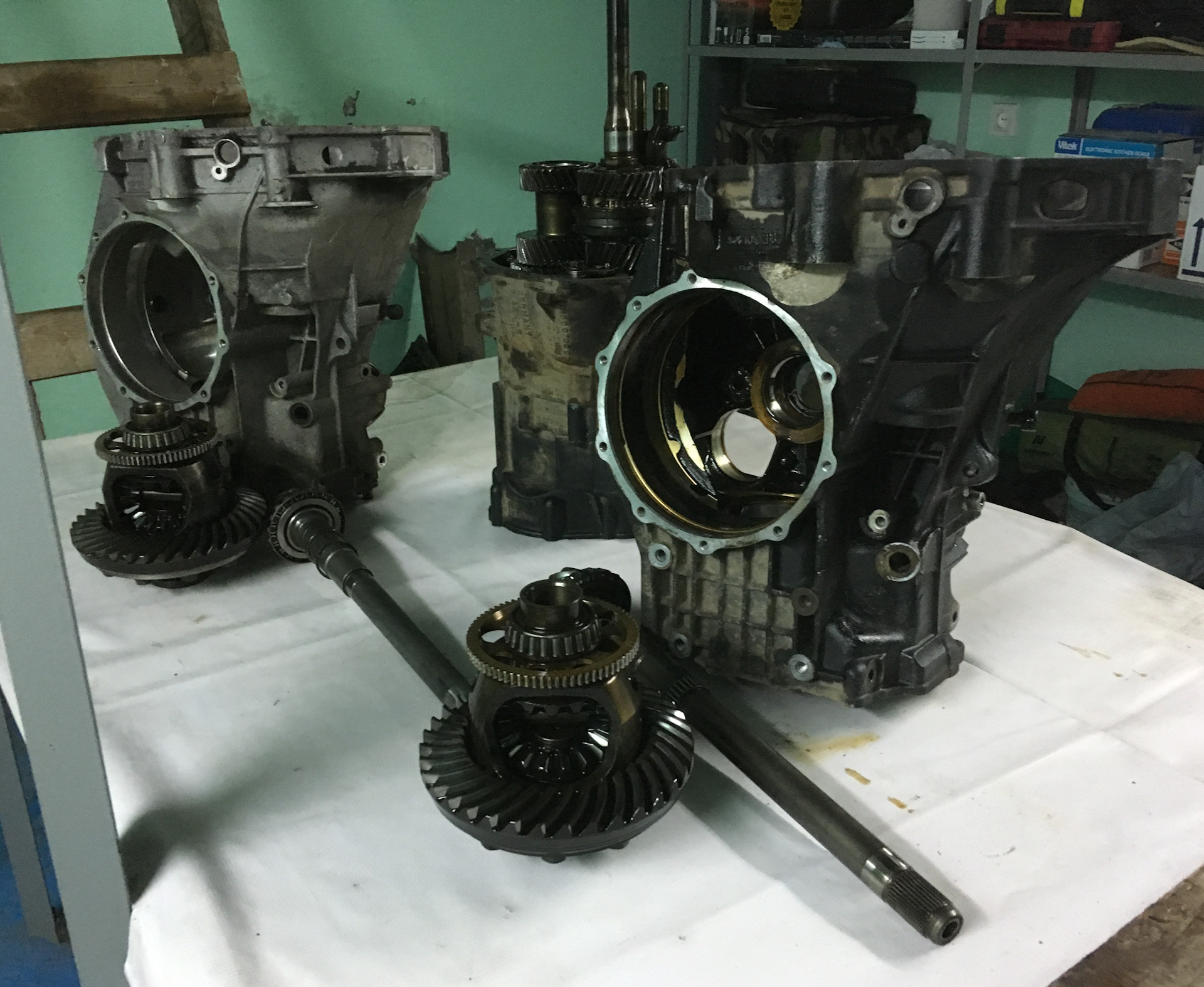 Год все руки не доходили. Но этим летом все-таки заставил себя заняться машиной, до кучи поменял в коробке все сальники и масло, ну и конечно поставил новое сцепление, потому как у старого был неприлично большой пробег, хотя работало нормально. Были опасения, что для переборки шестерен и подшипников на вторичном валу понадобятся специальные инструменты. Но все оказалось неожиданно просто, так как в коробках 01Е вся сборка вторичного вала живет самостоятельно на пустотелом валу-шестерне, а вторичный вал просто вставляется внутрь без каких либо танцев с бубном.