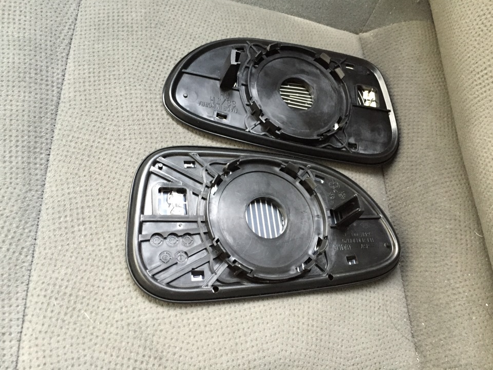 Перед тем как устанавливать новые стекляшки с элементами обогрева, нужно не много прогреть промышленным феном и посадочное место и заднюю пластмассовую часть новых зеркал, а то защёлки могут треснуть или поломаться, установить очень легко