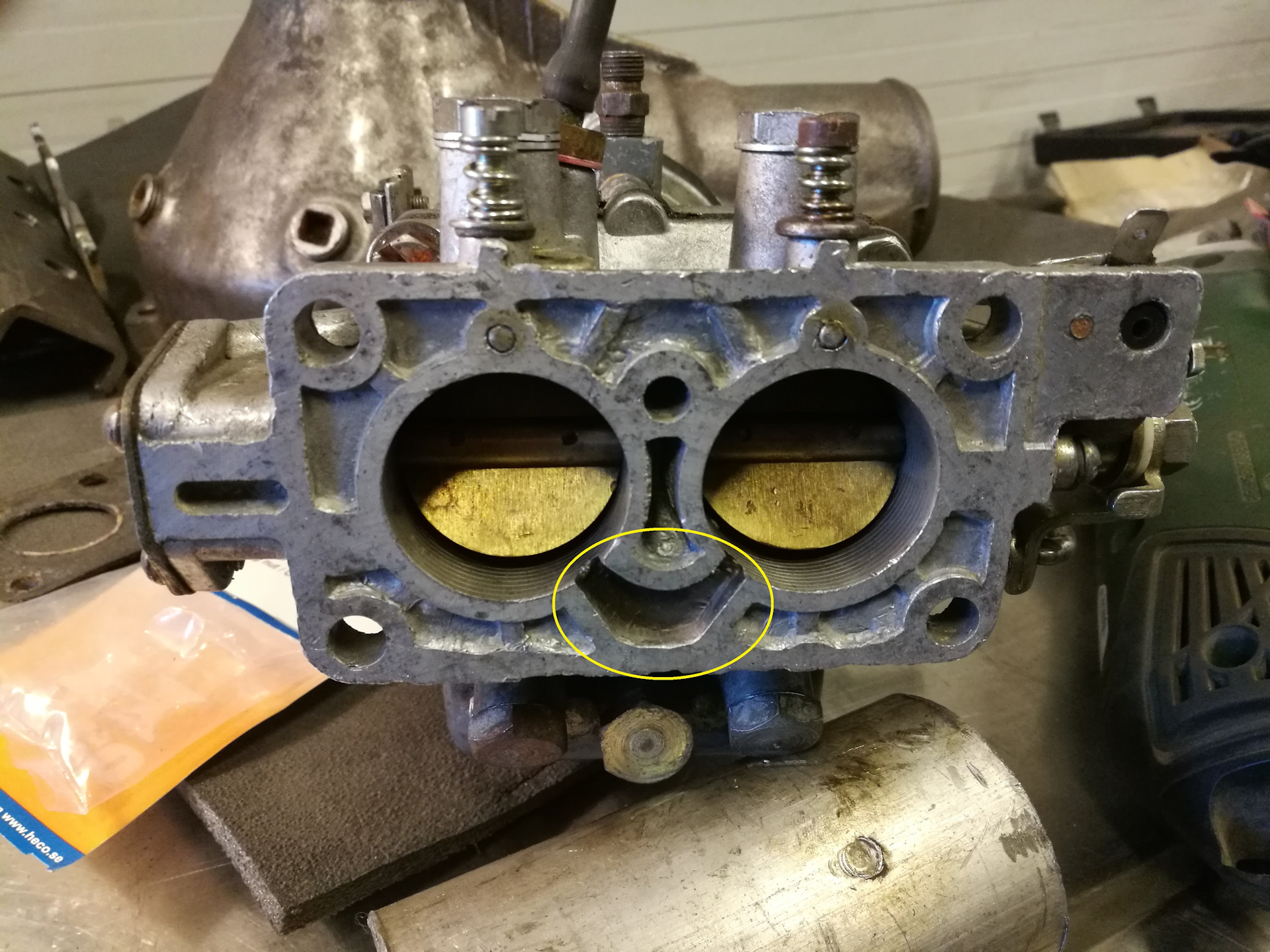 Еще один нюанс, который важно устранить. Перепускной канал между камерами карбюратора (на картинке выделен желтым кружком).