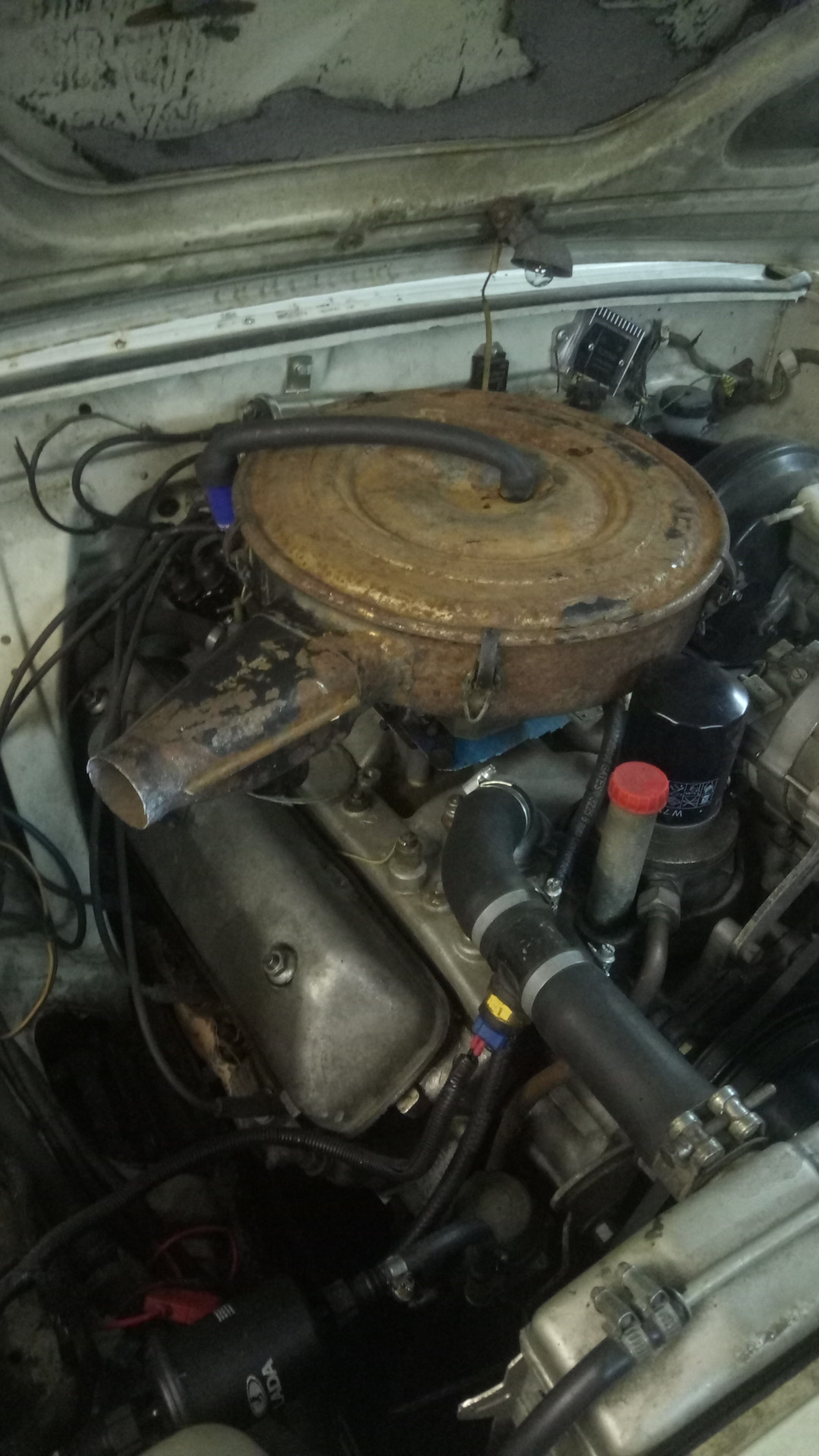 Воздушный фильтр я оставил родной. Во-первых, не надо ничего выдумывать, во-вторых, от него идет сосок на компрессор, и это надо учитывать при переделке. Был у меня родной зиловский постамент под фильтр, но он не подошел по росту и, кроме того, на него плохо садится сам фильтр.