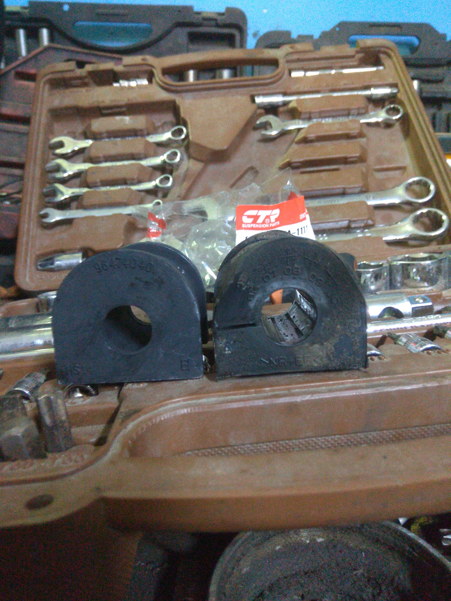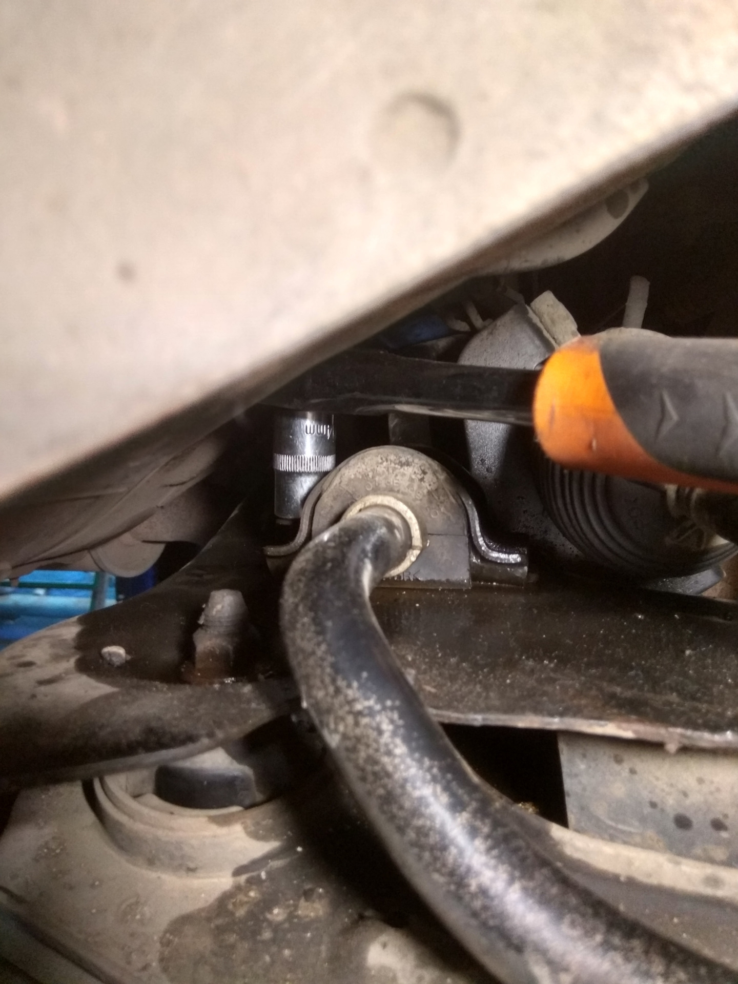 Пригнав машину, загнал lachik к Куму на подъемник, посмотреть, что да как. Вобщем, сказал только поменять стойки и втулки стабилизатора. Начитавшись тырнета как менять втулки, выбрал денёк и поехал на замену. Сразу хочу сказать, откручивать болты втулок с больной спиной не приятное занятие:).