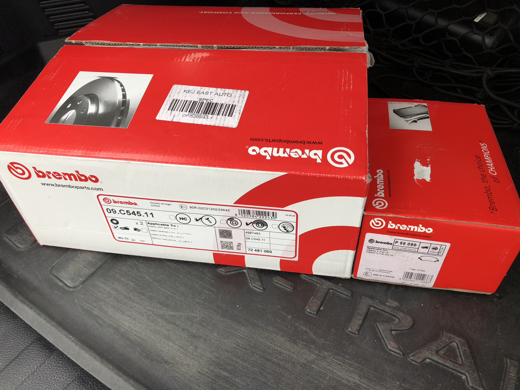Сегодня заехал в клубный автосервис, где оперативно (минут за 15) поставили на мой X-trail T-32 купленные ранее диски и тормозные колодки Brembo.