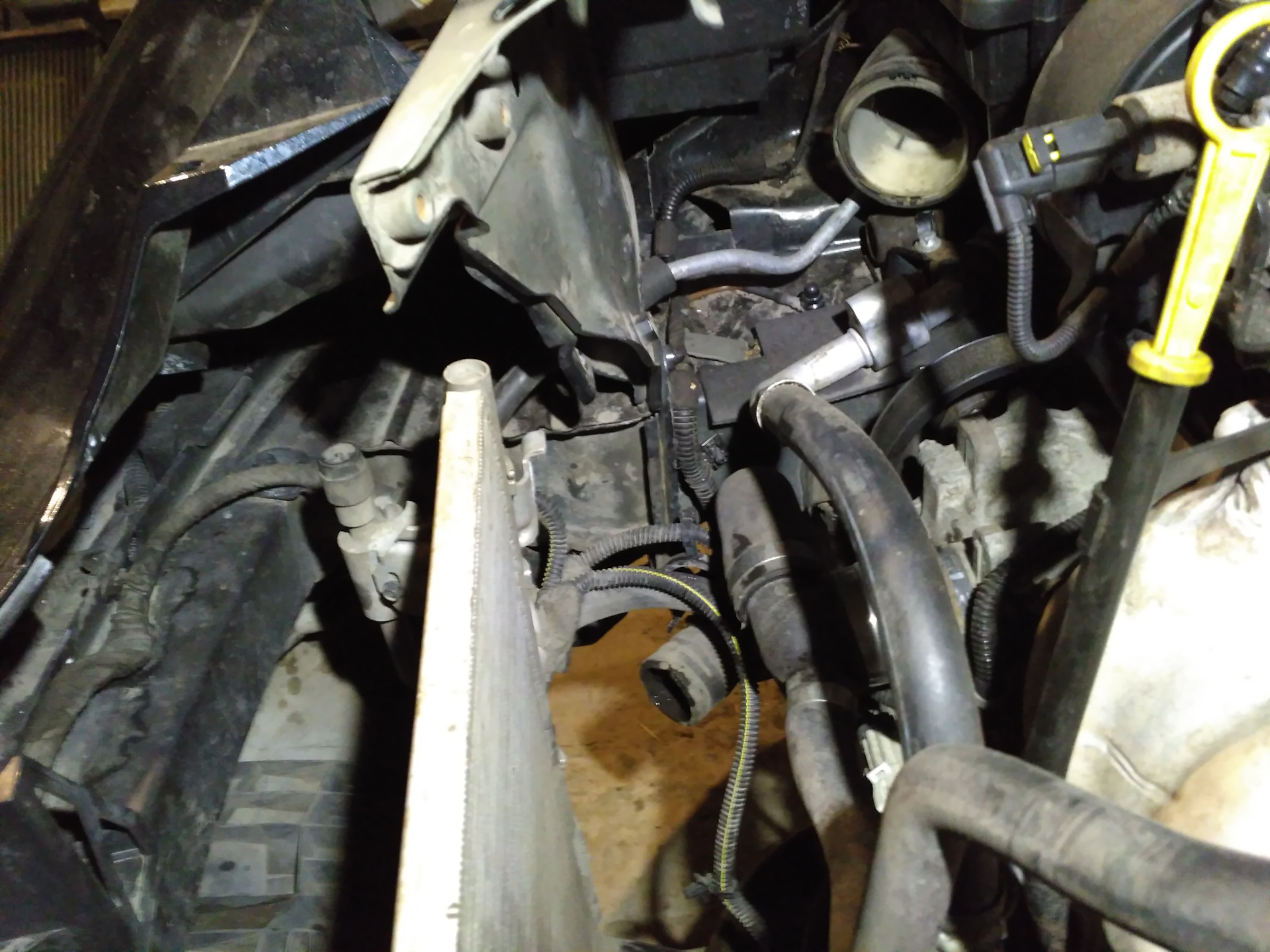 И начинаем снимать все подряд. Как кто-то упоминал, со снятой площадкой под аккум места больше и удобнее, времени на его снятие надо не много. Очень пригодится инструмент для снятия самозажимных хомутов. Очень неудобно их снимать, особенно с нижних патрубков. Может на подъемнике удобней — я даже ямой не воспользовался. Наверное подойдут переставные клещи. Я пользовался чем-то похожим на переставные пассатижи — не айс. Обычные пассатижи вообще отстой. Собирался перед этой процедурой прикупить переставные клещи — как-то не сложилось — пришлось работать тем, что было под рукой. Значительную часть времени я потратил на снятие этих хомутов. Думал снять шланг с термостата, а потом на снятом радиаторе было бы удобнее нижнюю часть отсоединить, но на термостате как-то очень плотно шланг сидел, даже со снятым хомутом не проворачивался — побоялся порвать и отказался от этого варианта.