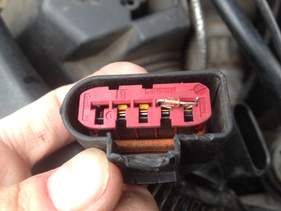 Для этого катод (= кольцо на корпусе) подключается к сигнальному кабелю LMM, а другое подключение диода к контакту 5 вольт (который сначала следует измерить относительно земли при включении зажигания, чтобы быть в безопасности). ). При подключении проводов подключения диода следите за надежностью контакта в разъеме и не погните контактные пружины, при необходимости закрепите диод на разъеме липкой лентой, чтобы он не выпал.