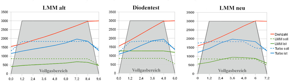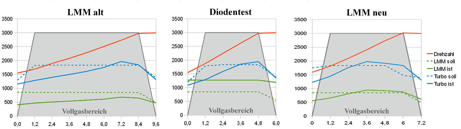 На следующих диаграммах это убедительно показано. Слева приведены значения Bosch LMM 038 906 461 2001 года выпуска 9-летнего и 235 000-километрового ACV, в середине значения во время проверки диодов, а справа значения нового LMM . старый ЛММподается только около 700 мг/ч вместо требуемых 800-950 мг/ч; в результате чего двигателю требовалось на 75 % больше времени от 1500 до 3000 об/мин — вместо 4,8 с хотя бы 8,4 с.
