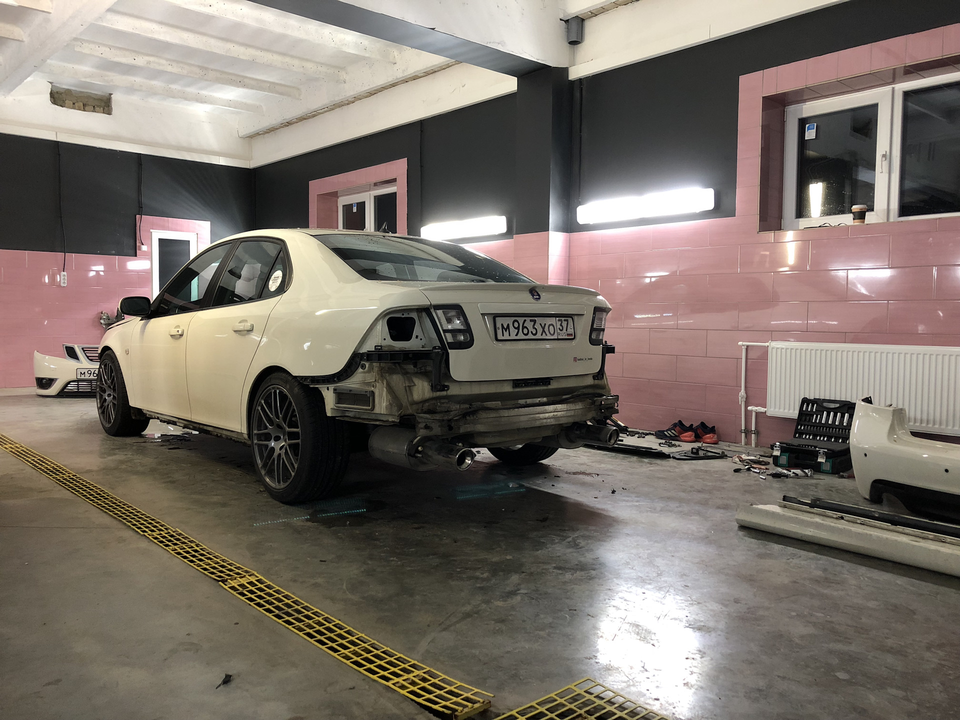 Часам к 7-ми вечера пятницы всё закончили. SAAB остался на выходные в тёплом боксе. А я остался озадаченным, как его переместить в понедельник через пол города в малярку. Проблема была в дожде. Ехать своим ходом с оголённым металлом не вариант. Надеялся, что с погодой повезёт. На худой конец готовился вызвать эвакуатор и всё заклеить. Ну и ещё отдельно вызвать ГАЗель, перевести снятые детали.