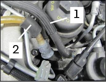 Если магистрали у самого ТНВД идут параллельно, как показано на рисунке, а верхняя магистраль (-1- обратная) тоньше, чем нижняя (-2- подающая), то ТНВД необходимо заменить.