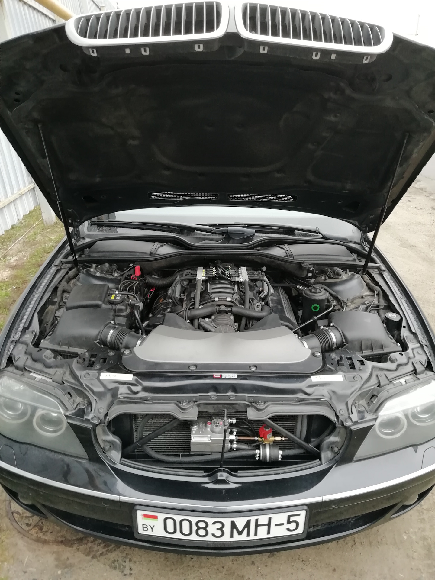 Теперь расскажу про трудности установки и про муки выбора. Под капотом n62b48 места нет, причем нет вообще, но это проблема установщиков. В авто не было вырезано ни одного отверстия кроме маленького в пепельнице для кнопки (её сфоткать забыл) и возможно под трубку, всё через штатные заглушки. Так как рампы с форсами без ножа поставить можно только на впускной коллектор, на данный момент буду кататься без верхней декоративной крышки (куплю такую же тогда порежу). Самый геморрой куда, как и какой баллон поставить. У меня: холодильник, клима для задних пассажиров — цилиндрический сразу отпадает, в запаску — компрессор пневмы.