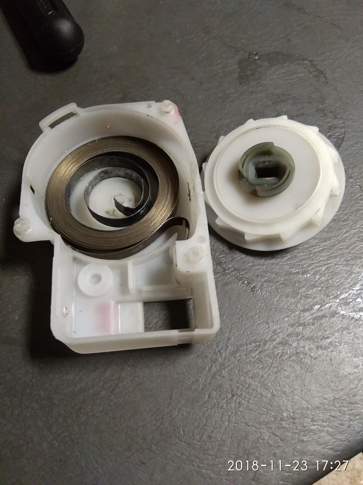 Как я помню принцип такой . Берете выдвигаете ремень полностью отделяете кишку с пружиной предпоследнее фото 2 с конца, суете отвертку плоскую в коричневую пластиковую деталь и крутите в сторону затяжки пружины. Вы поймете она будет стремится размотаться, крутите до упора, плотно прижав к полу. Затем берете полотно по металлу и суете в прорезь тоже на 2 фото с коца . Полотно поможет зафиксировать пружину в натяжке и ставите на место узел с фото сконца 2 к ременному узлу до щелчка клипс и все.