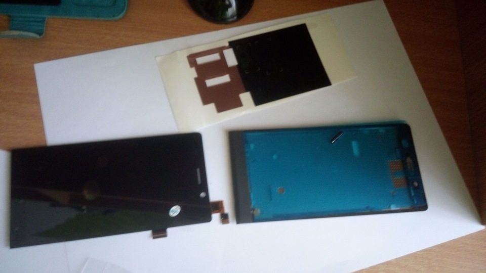 Пришел мне комплект: 1) дисплей в сборе с тачскрином (левый низ). 2) пластиковая рамка, в которую приклеивается дисплей (в пленочке, чтобы клей не повредить). 3) наклейкиоткручиваю все видимые болты и тот, который спрятан за белой пломбой. как и в роликеснимаю пластиковую рамку, болтики которой откручивал. она на застежках, подцеплял ногтем и зубочисткойсобственно со снятой рамкой.дальше нужно разжать замки двух шлейфов и их освободить. <img src=уже вытащил шлейф, осталось отсоединить длинный тонкий проводокосталось высвободить еще одну микросхему и можно собирать. Кстати, микросхемы помимо болтиков немного приклееныне забываем про динамик, он просто немного приклеен. В комплекте пришла еще сеточка (фильтр наверное) для динамика, ставил ее в новую рамку. Все логично и простодальше берем новый дисплей и новую рамку, продеваем два шлейфа в отверстия под них и приклеиваем дисплей на новую рамку (смотришь как на старом было и все), динамик не забываем переставить и новую сеточку-фильтр к нему. перекидываем обе микросхемы и подсоединяем все как было + клеим наклейки (шлейф от дисплея или тачскрина (не помню уже) идет под наклейкой). ставим родную рамку и закручиваем все