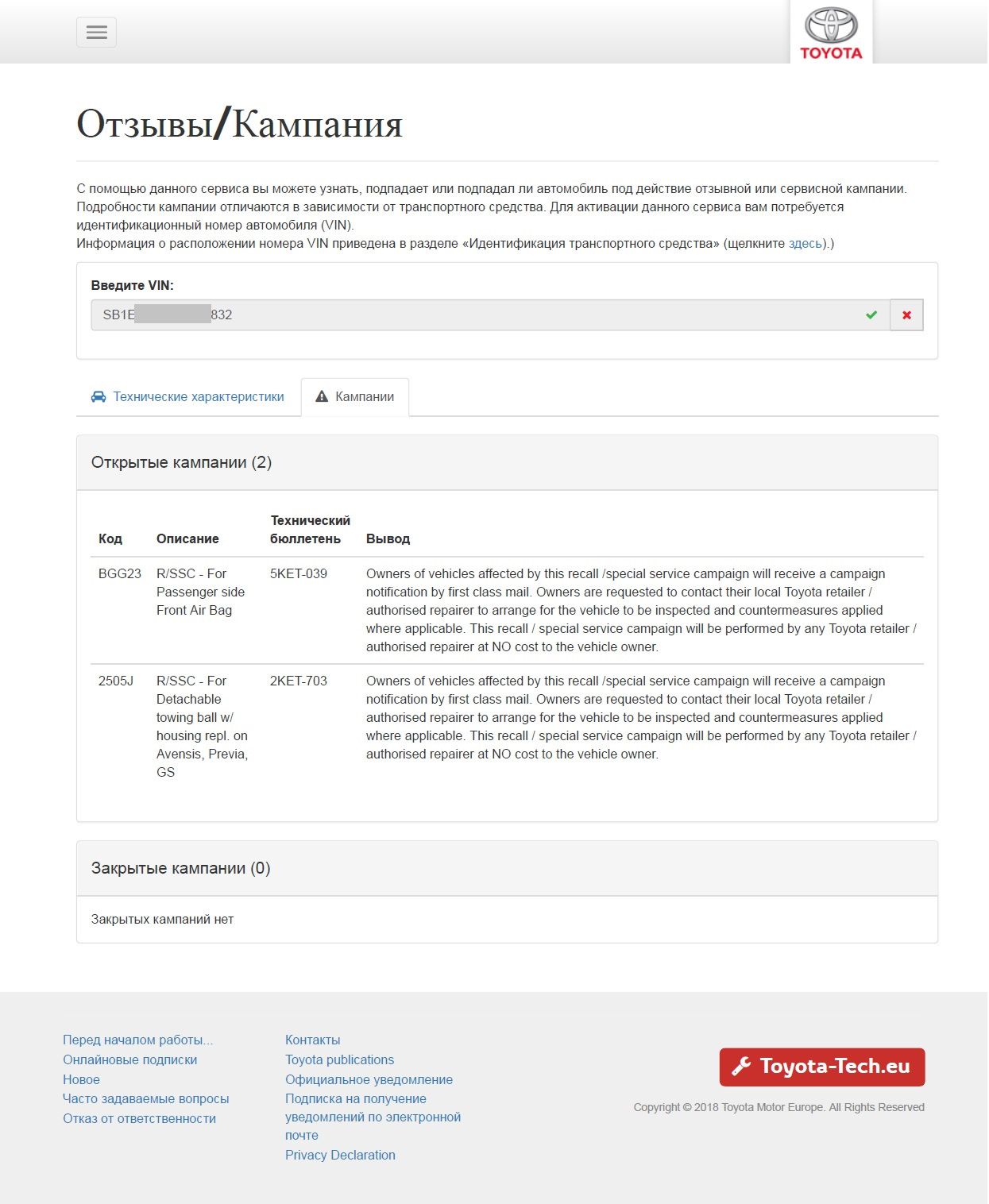 После появления информации о проводимой Тойотой отзывной кампании по замене газогенератора подушки безопасности переднего пассажира в AVENSISах, решил узнать, попадает ли мой автомобиль под данную акцию. После обращения в местный официальный дилерский центр Тойота, получил отрицательный ответ. Не горят желанием официалы нагружать себя дополнительными работами. Далее, проверив ВИН-код на официальном российском сайте, получил ответ об отсутствии сервисных кампаний для моего AVENSISа, но на сайте есть сноска: "*В настоящей базе данных проверяются только VIN-номера автомобилей, которые официально поставлялись на российский рынок компанией ООО «Тойота Мотор». Владельцы автомобилей Toyota, произведенных для других рынков (Японии, США и пр.) и импортированных на территорию РФ не компанией ООО «Тойота Мотор», также могут проверить свой автомобиль на наличие открытых специальных сервисных кампаний, позвонив на горячую линию Тойота по телефонам 8-800-200-57-75 (для бесплатных звонков из России) и +7-495-137-80-08 (для международных звонков) или обратившись к любому Уполномоченному Дилеру / Уполномоченному Партнеру Тойота или в Авторизованный Сервисный Центр Тойота за составлением специального запроса на проверку официальному Дистрибьютору»." А так как AVENSISы (в т.ч. и мой) с дизельными двигателями официально в Россию не поставлялись (машина пригнана из Германии), я полез на буржуйский сайт Тойоты, где и были найдена искомая сервисная кампания 5KET-039, а также 2KET-703 — "Замена съёмного буксирного устройства". Позвонил на "горячую линию", объяснил ситуацию, сделали запрос на завод-изготовитель. По истечении 3-х дней получил одобрение завода-изготовителя. Далее звонок из Тойота Центр Рязань, запись на обслуживание и проведение работ по замене блока наполнения (газогенератора) подушки безопасности переднего пассажира.