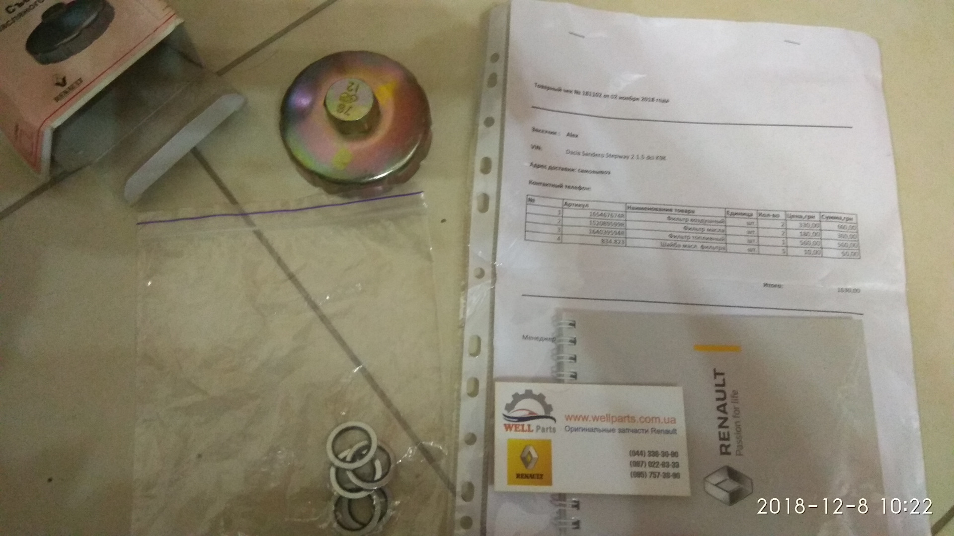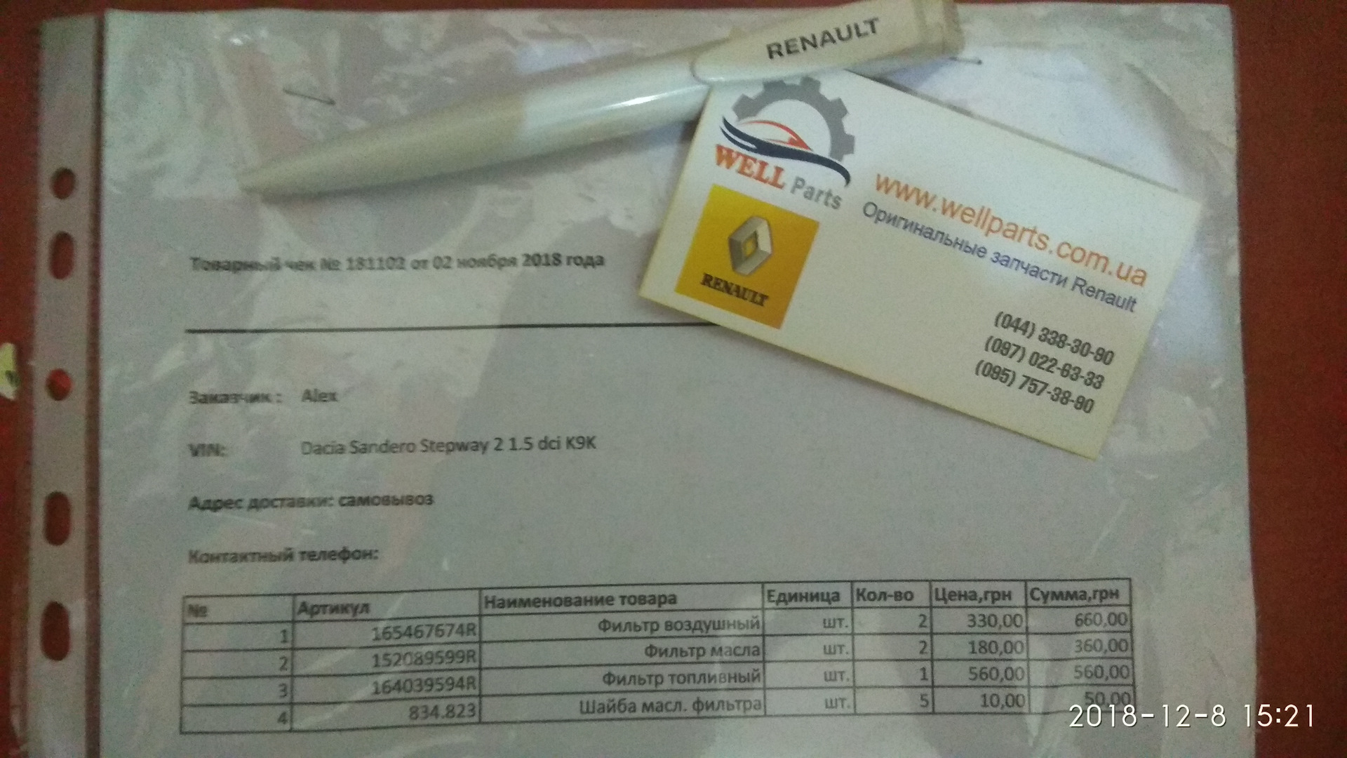 Так получилось что мой друг должен был лететь в Киев и тут подвернулась возможность через него получить все что мне надо. Друг летел в Киев на несколько дней, но не понятно было когда он сможет все забрать.Я списался с Дмитрием о том что мне надо и тут мне на вайбер приходит сообщение с фото заказа, что ваш заказ готов и все ждёт вашего друга в магазине.Я очень обрадовался и даже немного был в шоке, сразу сообщил данные магазина своему другу, но блин так получилось что времени у него на поездку в магазин не находилось, тут я начал нервничать, потому как человек мне уже оформил заказ и все готово, а забрать не как.Оставался последний день, дело уже было немного поздненько, часов между 22 и 23 друг сообщил что освободился и может заехать по адресу, тут я сказал что уже поздно, но Димитрию из Велпартс сбросил сообщение что можем забрать заказ сегодня и что вы думаете, мне приходит ответ :"нет проблем буду его ждать все принесу на место о котором договорились" .Друг берет такси и летит туда, слава богу они встретились, он все получил и оплатил на месте.Мне было передано все что я хотел приобрести, речь шла чисто об оригиналах, а это два воздушных фильтра и 2 масленных фильтра, 5 колечек с резиновой прокладкой для пробки масленного слива и один фильтр для солярки, все это мне обошлось в 1630 гривен или по нашему 200 шекелей.Очень жалею что не заказал фильтр для кондиционера, но может будет ещё удобный случай. Сегодня наконец то мой заказ доехал до меня, кстати в подарок получил записнаю книжку и ручку с лого от Рено, мелочь но мне очень приятно.Большое спасибо Дмитрию за все, такой сервис у нас может нам только снится.Повезло вам местным, что у вас есть такой магазин и такие люди, очень рекомендую посетить Дмитрия и его сайт.