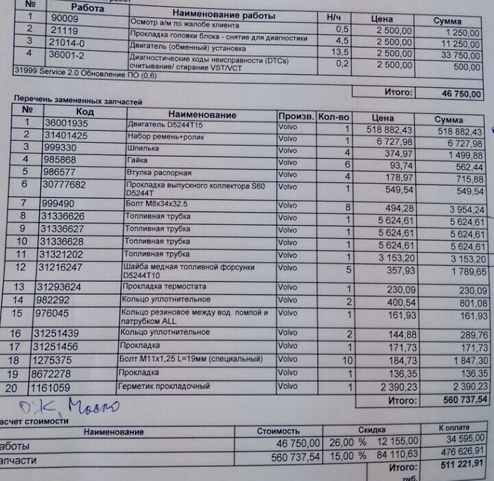 Kolega 2 goda nazad "popal" tozhe na xc60 12 goda…jemu chiut lutshe, tolko golova i prokladka novovo obrazca…povezlo, chto u nevo byla extension warranty ot Volvo…probeg byl do 100t km, tak nado bylo doplatit okolo 10 proc., jesli pravilno pomniu…v servis biuletene pisali, chto jest risk na etot nomer dvigatelia,
