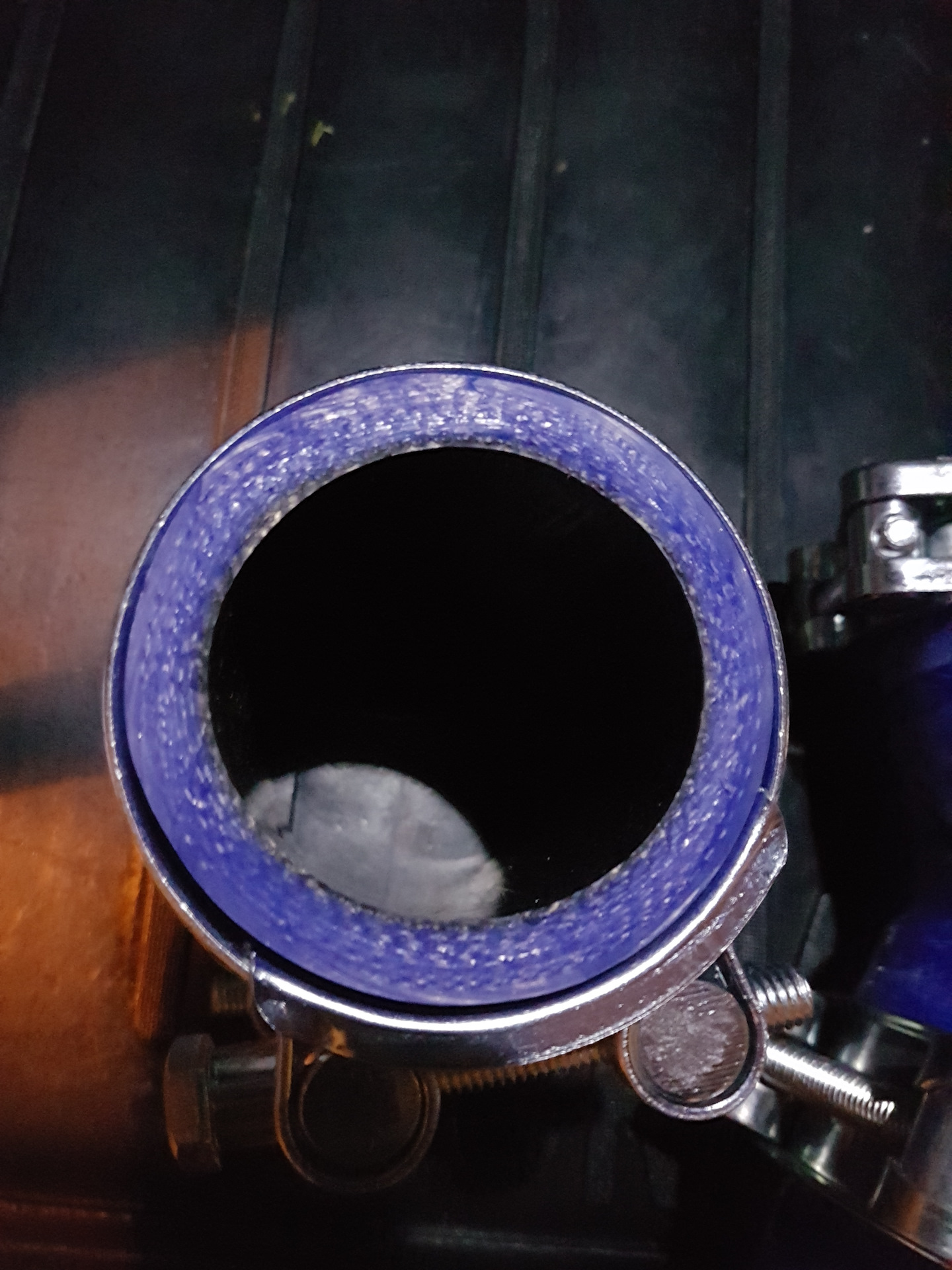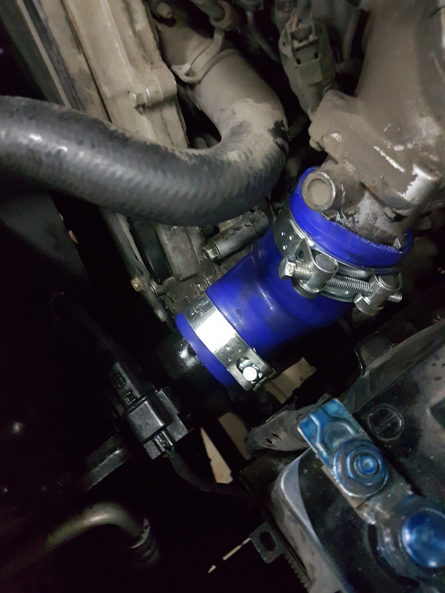 Патрубок, который у мягкой глушилки (рядом с аккумом), верхний хомут не на месте. Он должен быть существенно выше, ближе к торцу. Если оставить вот так — сорвет стопудово. Хомут пднять повыше… Причем сорвет под нагрузкой, не дай бог на обгоне…