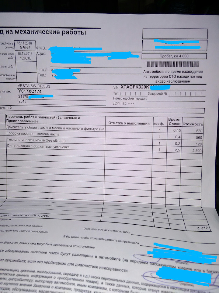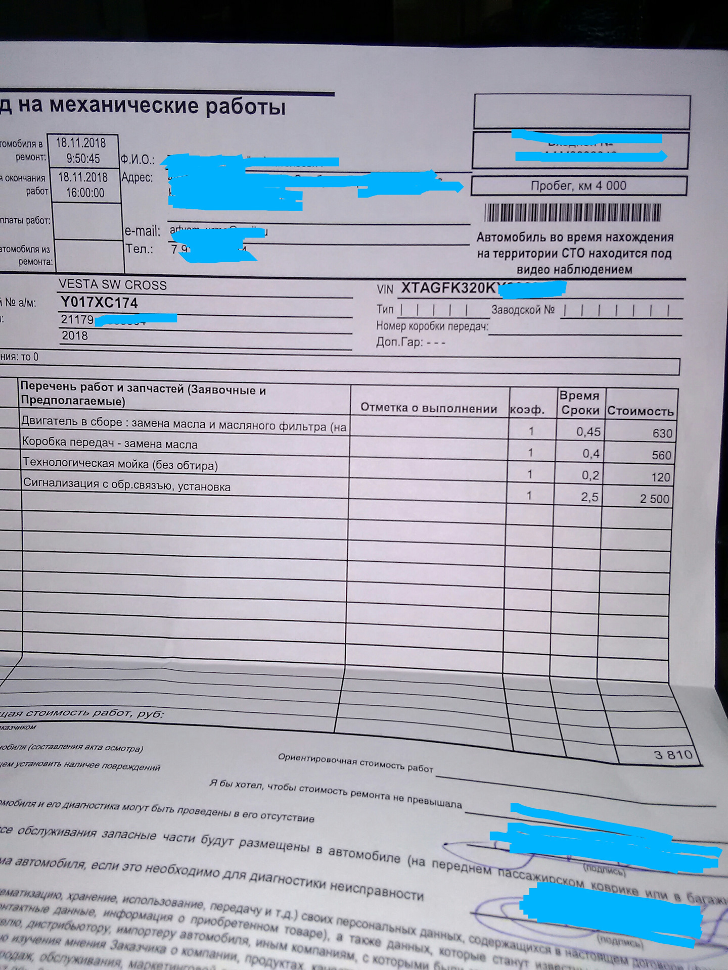 На 4000 делал нулевое ТО Масло привёз своё и в мотор и в коробку, фильтр тоже свой. Замена всего этого, плюс мойка, плюс полная диагностика, плюс протяжка ходовой у ОД вышло в районе 2700, из этого протяжка (900) и диагностика (500) сугубо моё личное требование. Подтверждение цен в прикрепленном фото (предварительный заказ наряд). Сигналку в итоге не поставили, зато протяжку и диагностику добавили.