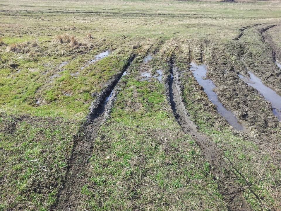 Ехать напрямик не стали, т.к. там в это время даже в сапогах было нереально пройти (если только по краяшку в обход). В конце прошлого лета помнится застрял там на штатных баргузинах (полез по-неопытности, штурмовал сходу, да и воды было поменьше). В тот раз трактор нас с трудом вытащил. Было решено объехать справа. Весення размытая земля очень обманчива, свиду вроде бы ничего, но колёса подзасасывает быстро. Однако, машина проехала, оставив характерный след.