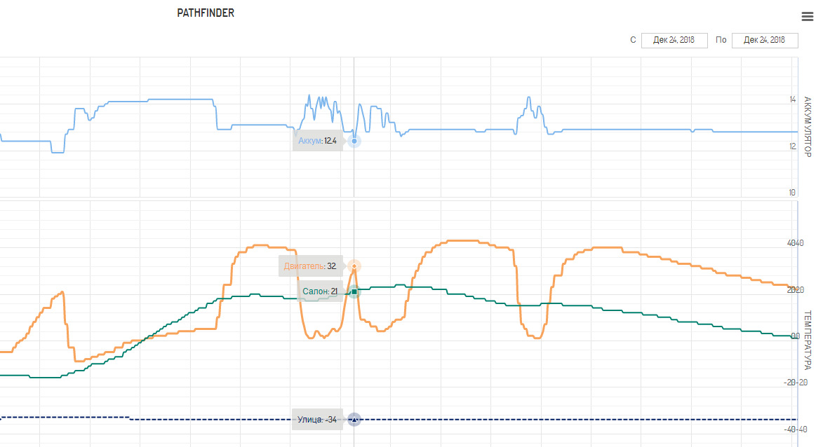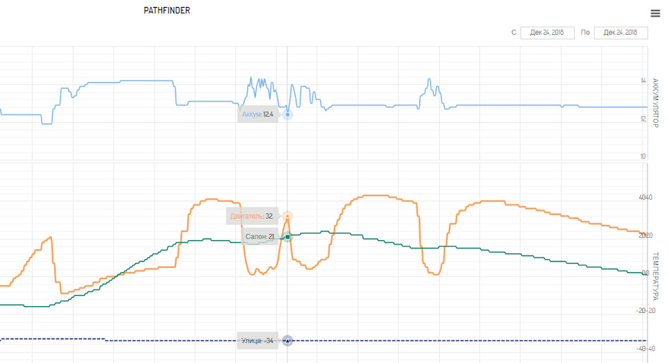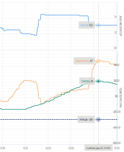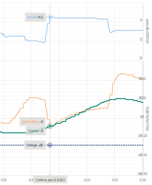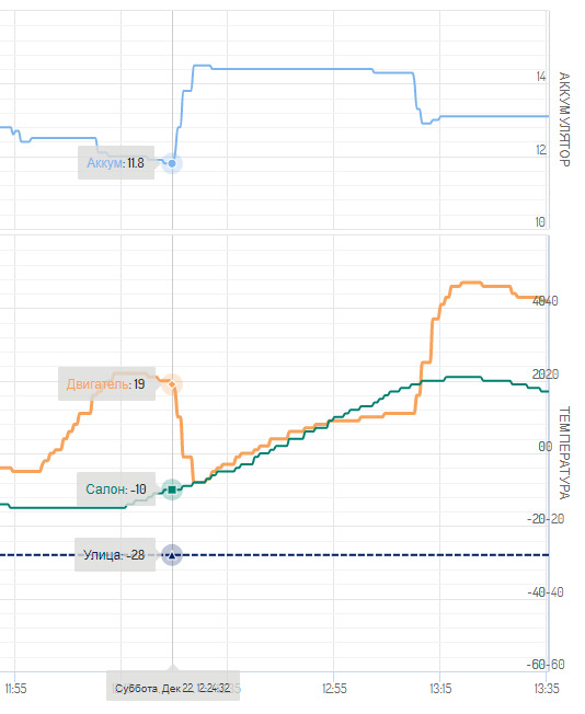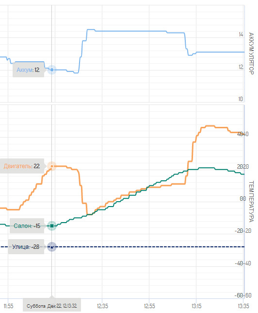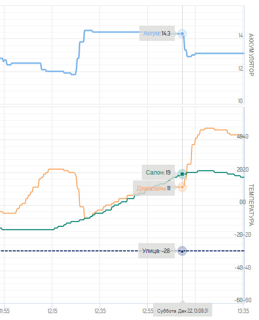 В общем, как-то так. При -30 за бортом следующий автозапуск (читай — время падения температуры до -5) происходит примерно через 4 часа.