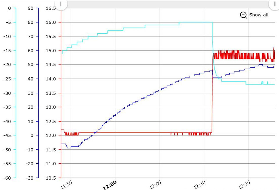 Я что-то вообще не понимаю ничего. Вот тут покатался чуть-чуть по городу, на _любой_ запуск двигателя происходит резкое падение температуры. И она не возвращается пока двигатель не заглушишь. На графике это очень хорошо видно по напряжению сети. Ровная горизонтальная линия — автомобиль заглушен, напряжение ~12.8, когда напряжение выше — двигатель заведён.