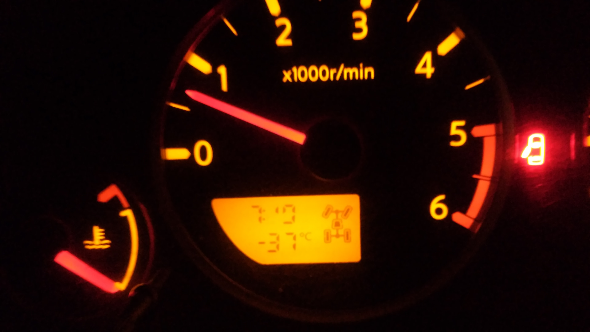У нас сейчас (23.12.2018г. 20:58) примерно -32С, на фото видно температура в салоне. На утро обещают -42С, по ощущением как -50С.