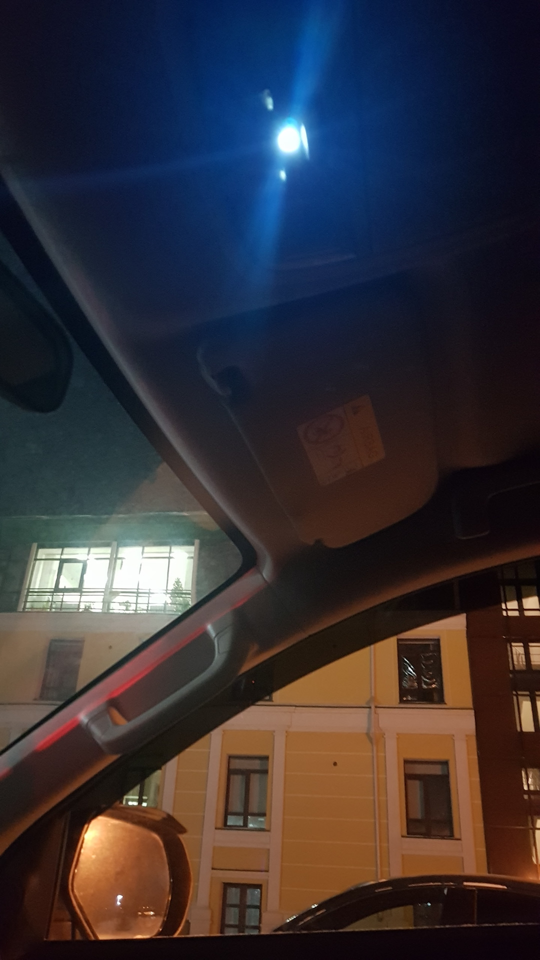 на предыдущей машине была фоновая или как её там подсветка в салонном плафоне. тут же темно. пришлось допилить. А точнее досверлить. вставлен диод из подсветки тазов за 10 руб. предварительно затуплен напильником. чтобы свет не бил точкой подсоединен на посветку кнопки глонасс. яркость была убавлена с помощью спиртового фломастера.