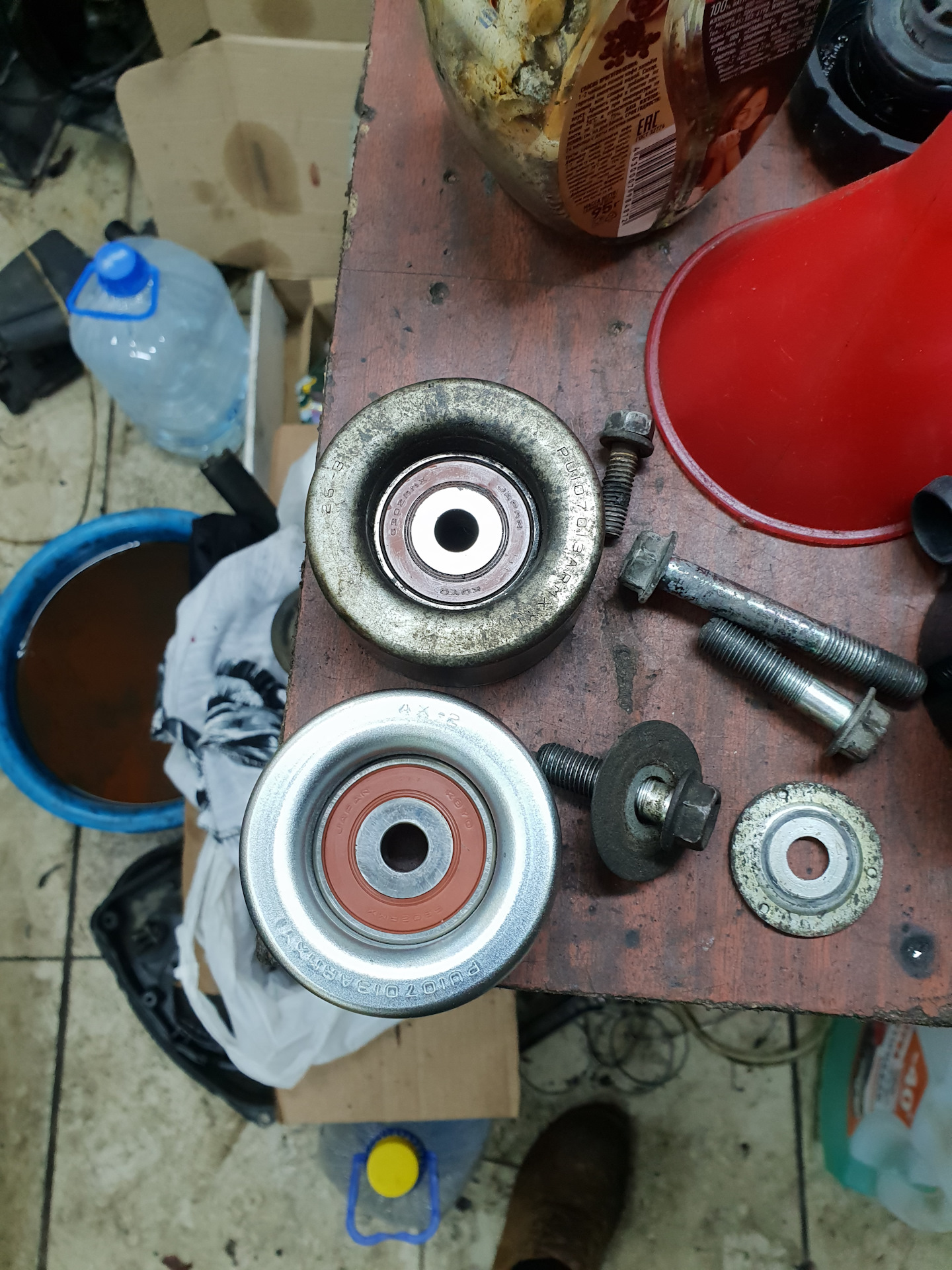 за одно поменял подшипники в натяжном ролике, в шкиве кондиционера, обводной ролик поменял целиком, везде подшипники koyo, кроме коньдея там NSK.